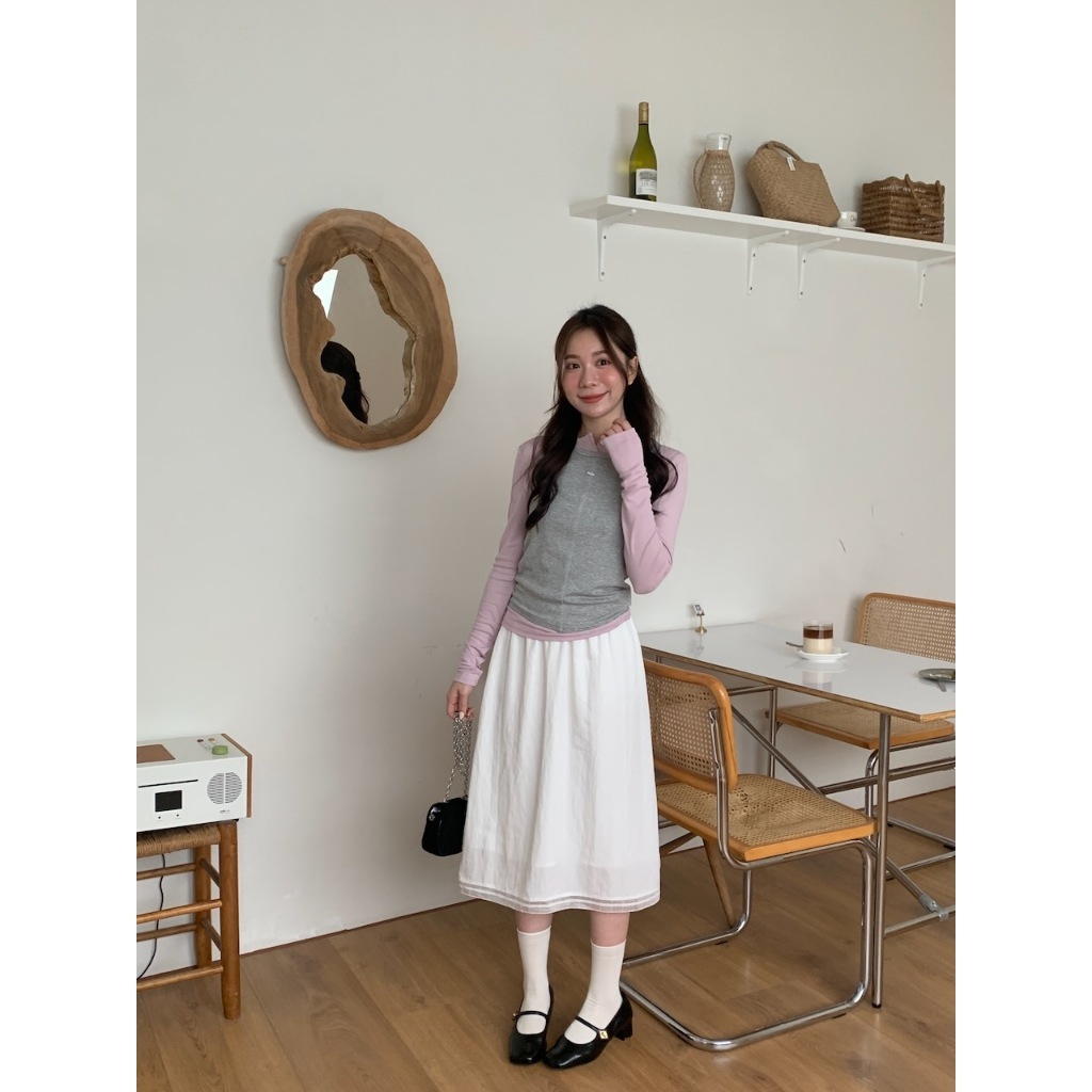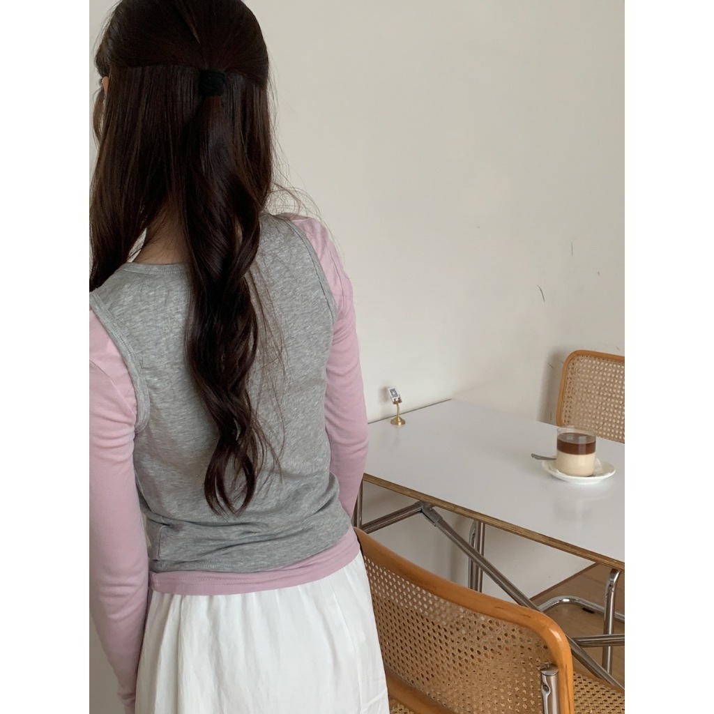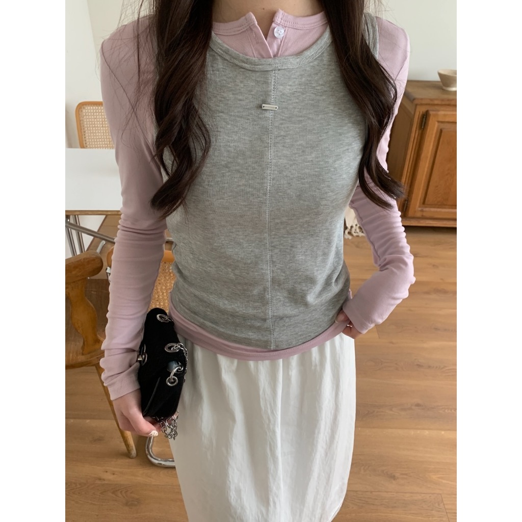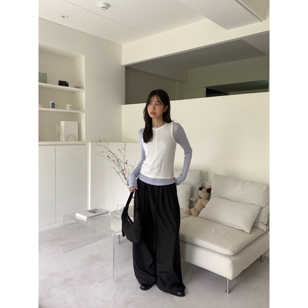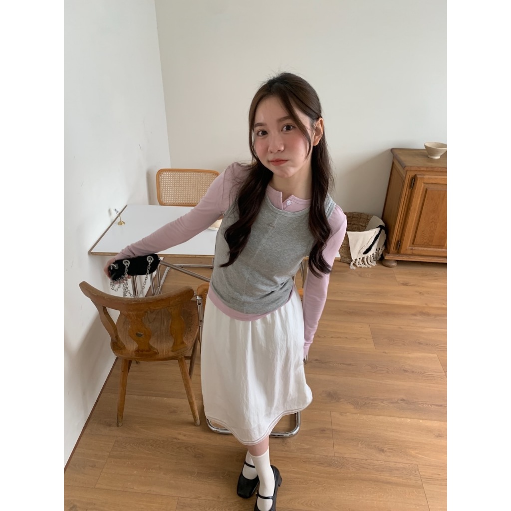 ※圓領 無袖坦克背心 腋窩略寬 中長版 胸前逢飾扣 胸前縫一條車線設計 薄微透 蠻有彈性