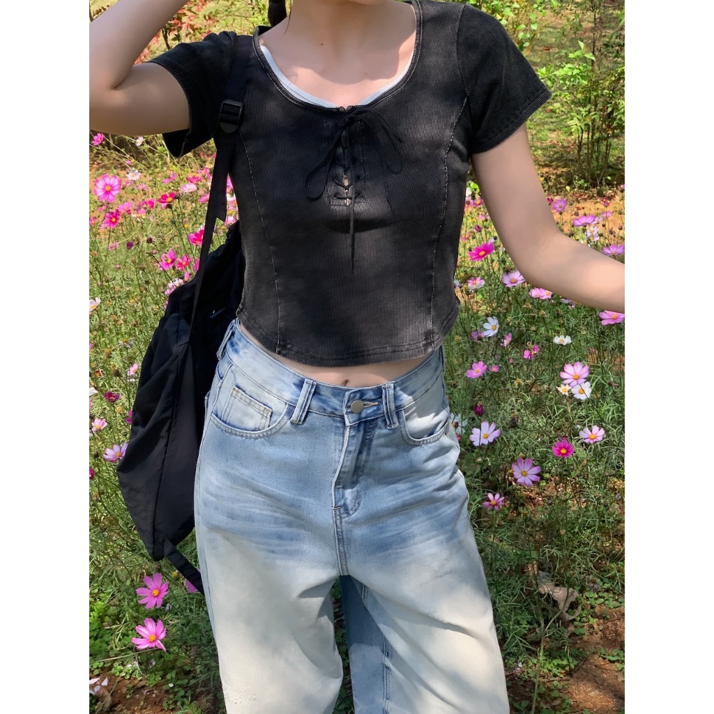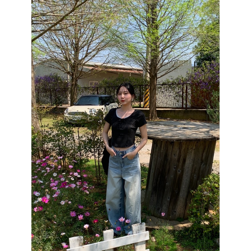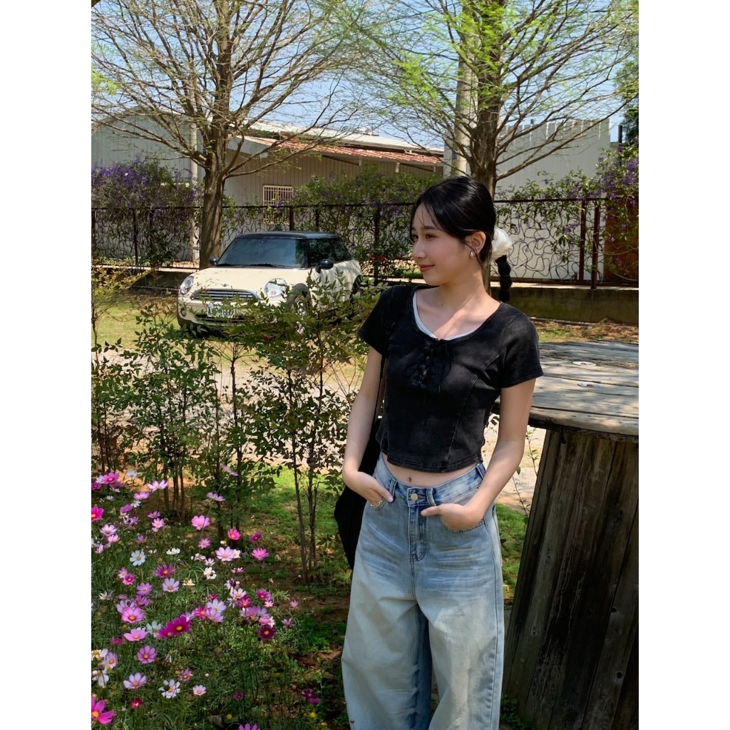 方領 領口綁繩設計 弧形車邊 下擺圓弧 短版 水洗感
