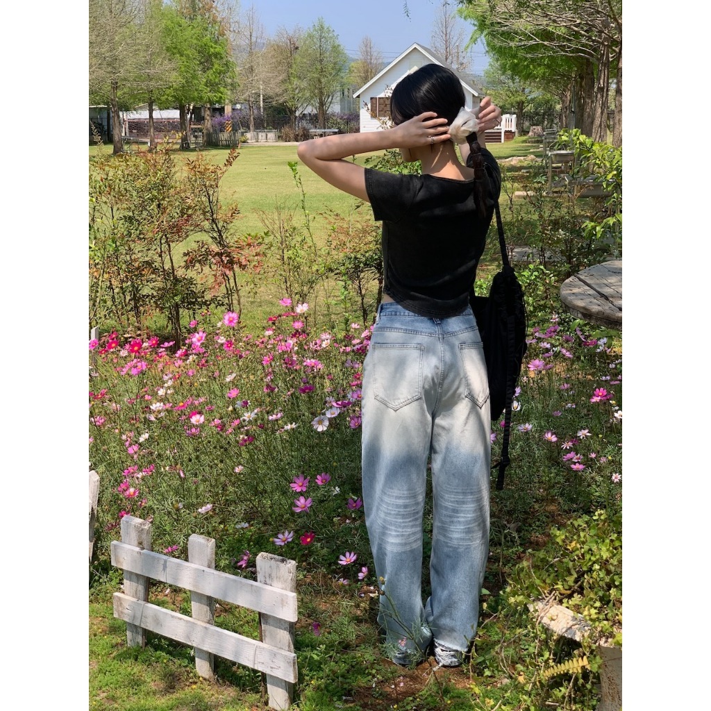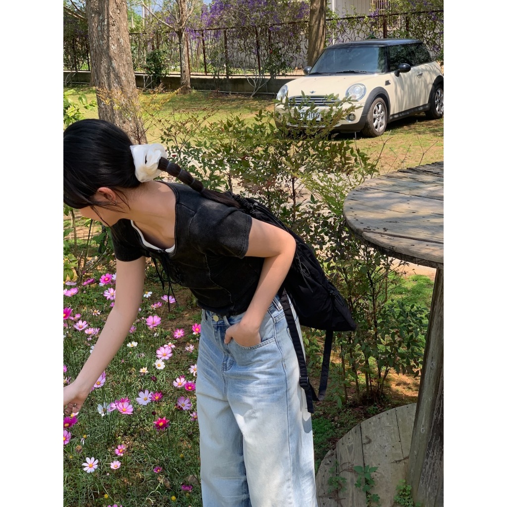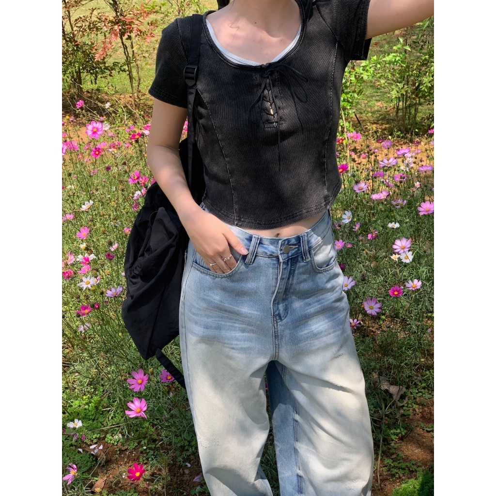 方領 領口綁繩設計 弧形車邊 下擺圓弧 短版 水洗感