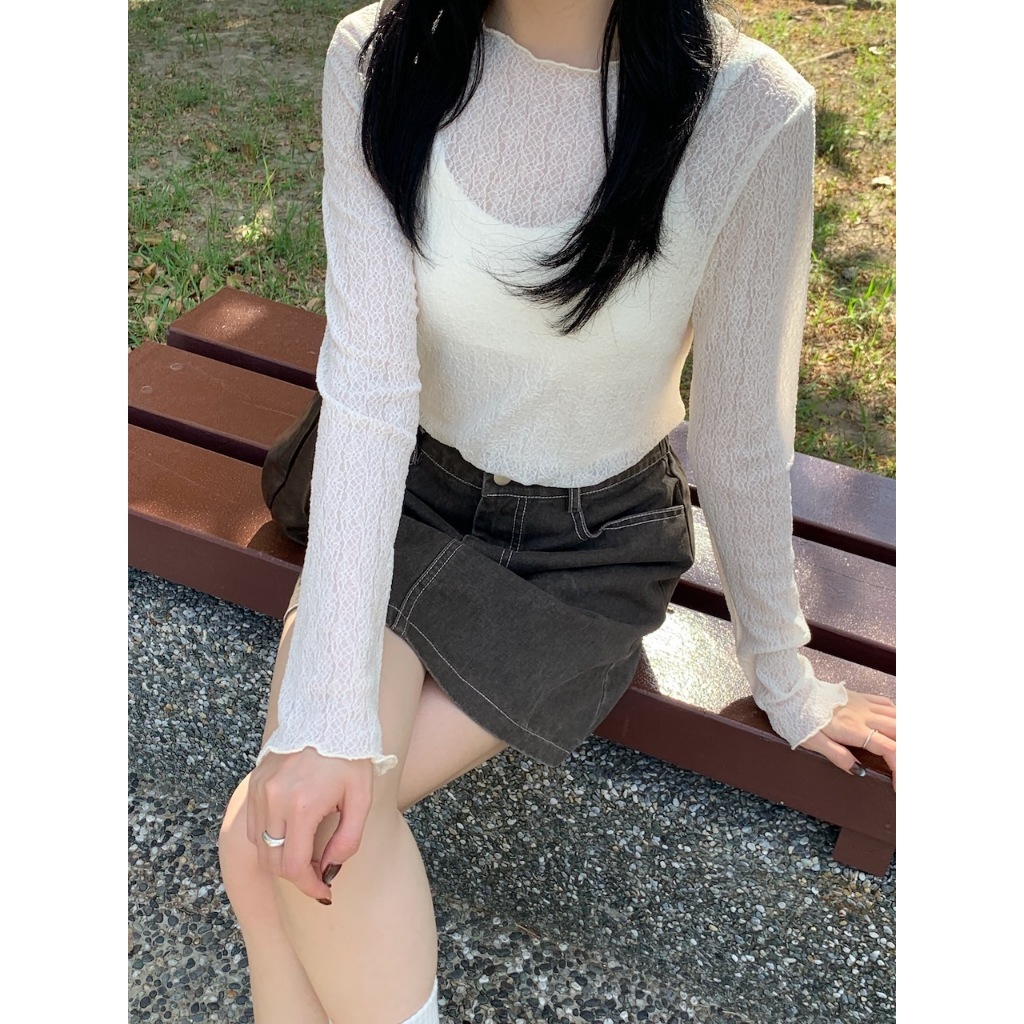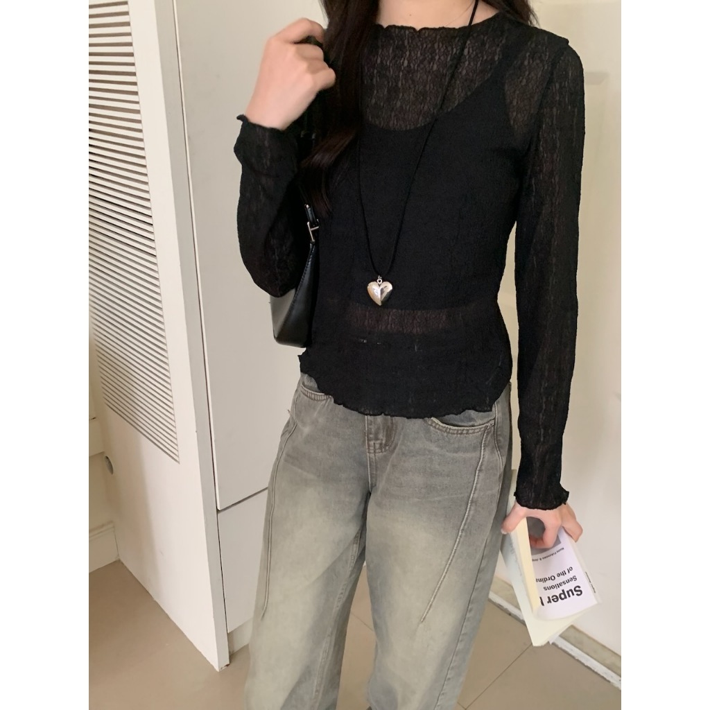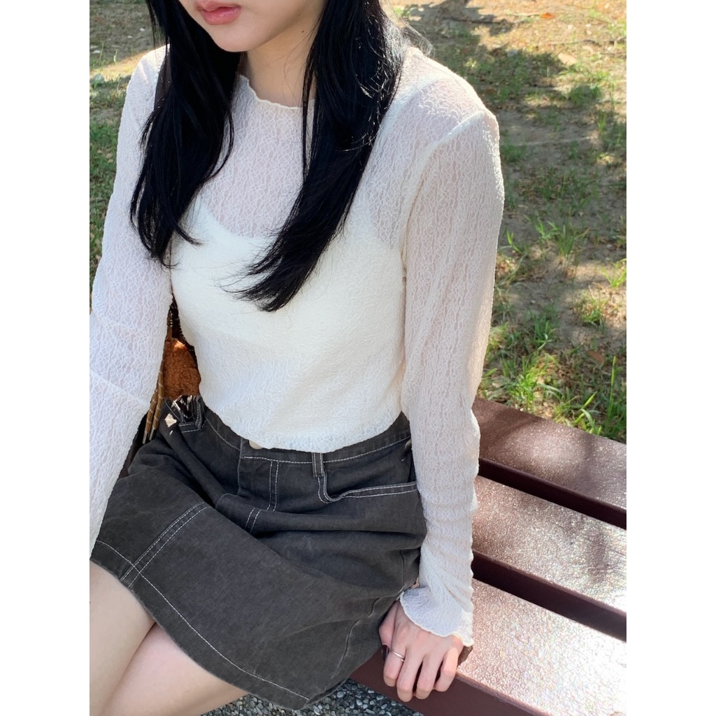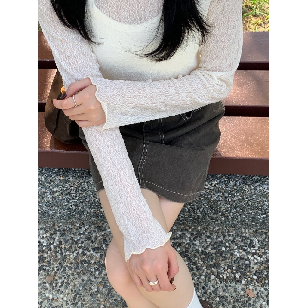 ※圓領 透膚內搭 蕾絲雕花設計