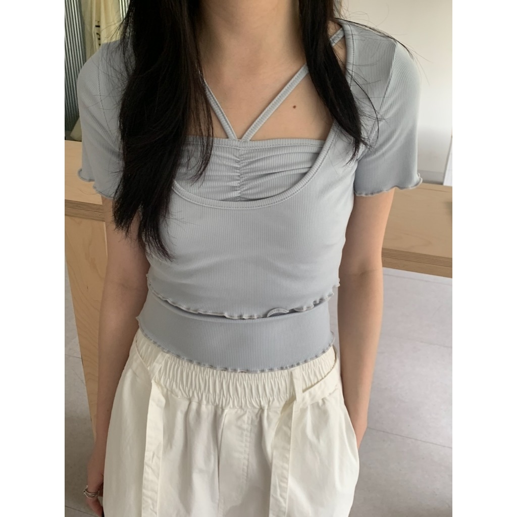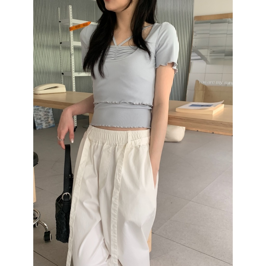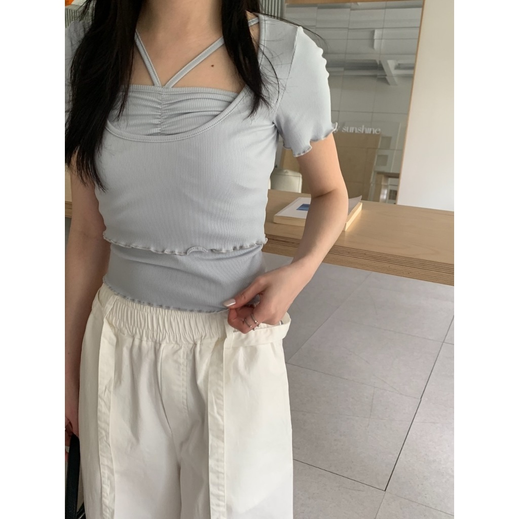 ※背心:平口 胸前V字肩帶 上胸抓皺設計 下擺木耳邊 直條紋針織紋路 素色