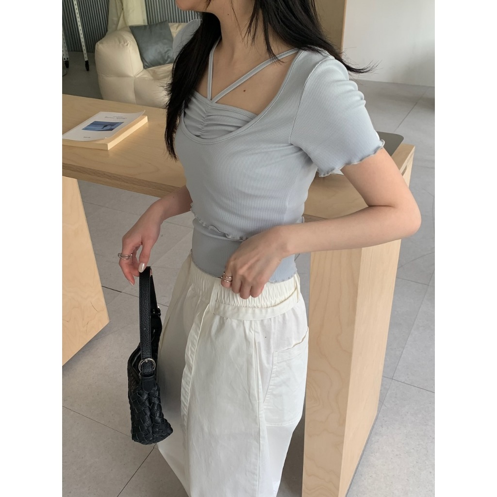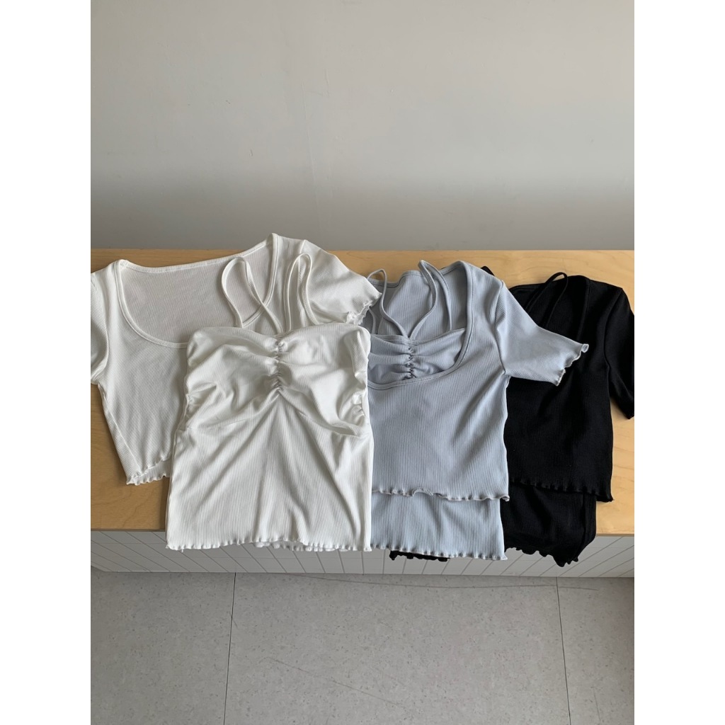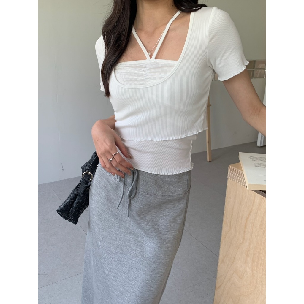 ※背心:平口 胸前V字肩帶 上胸抓皺設計 下擺木耳邊 直條紋針織紋路 素色
