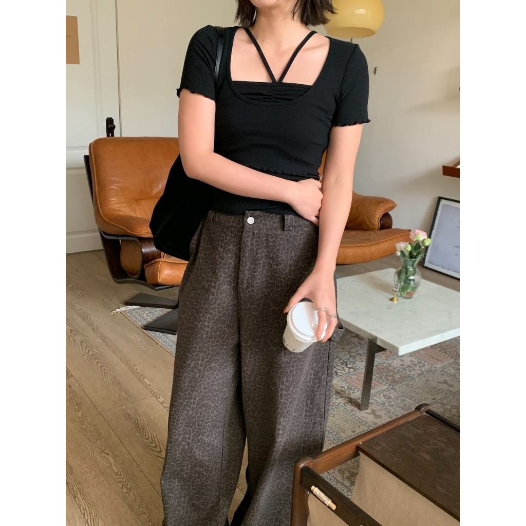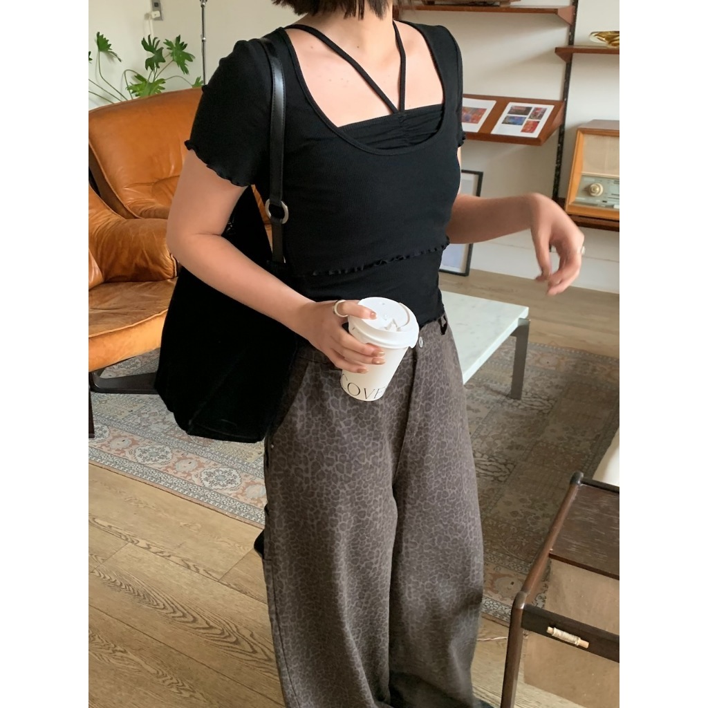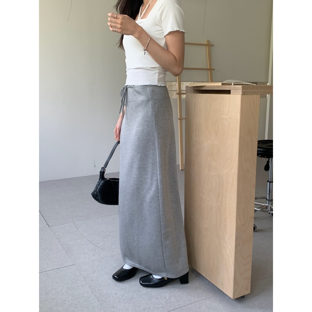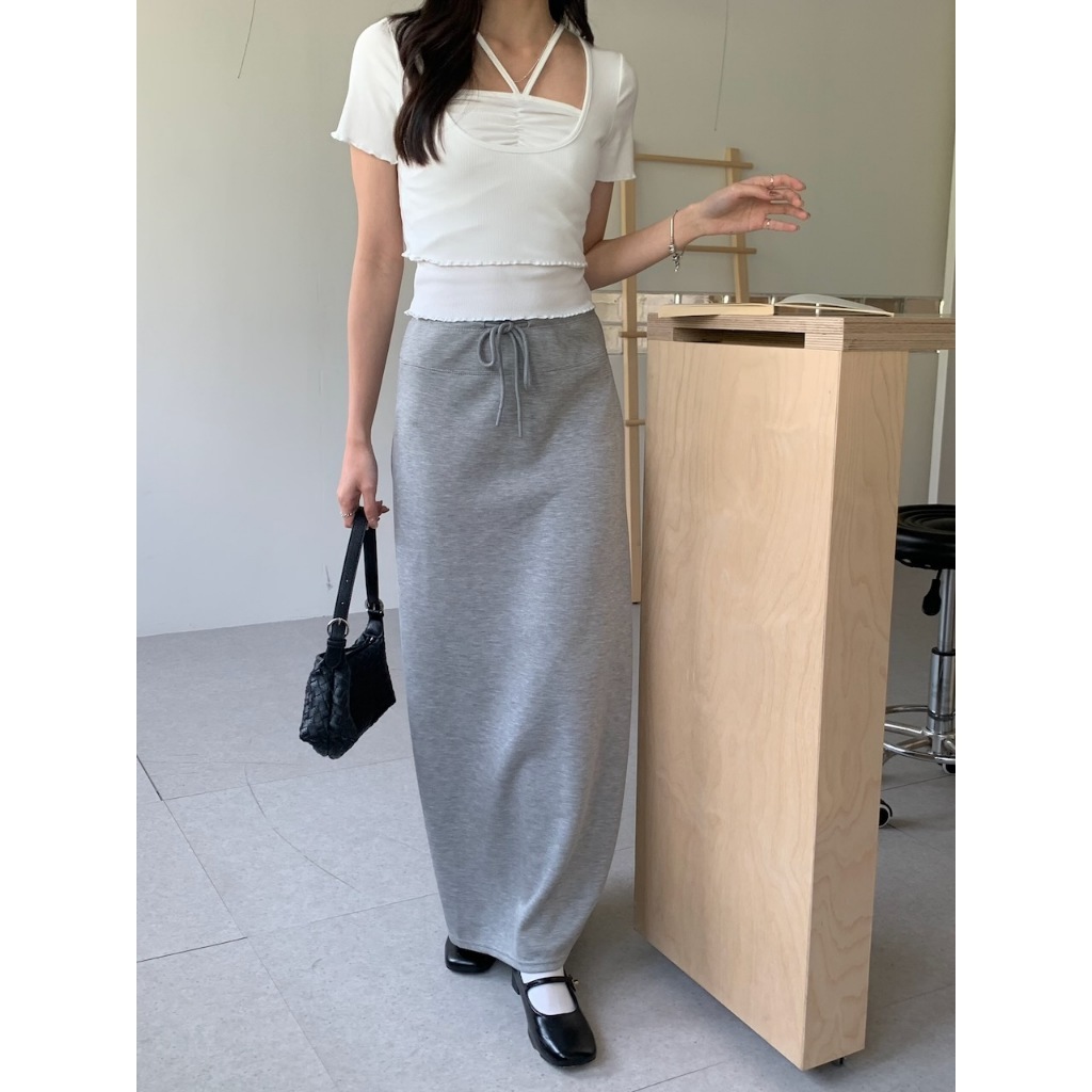 ※上衣:短版 前短後長 寬圓領 手袖、下擺木耳邊 直條紋針織紋路 素色