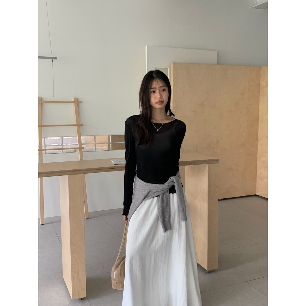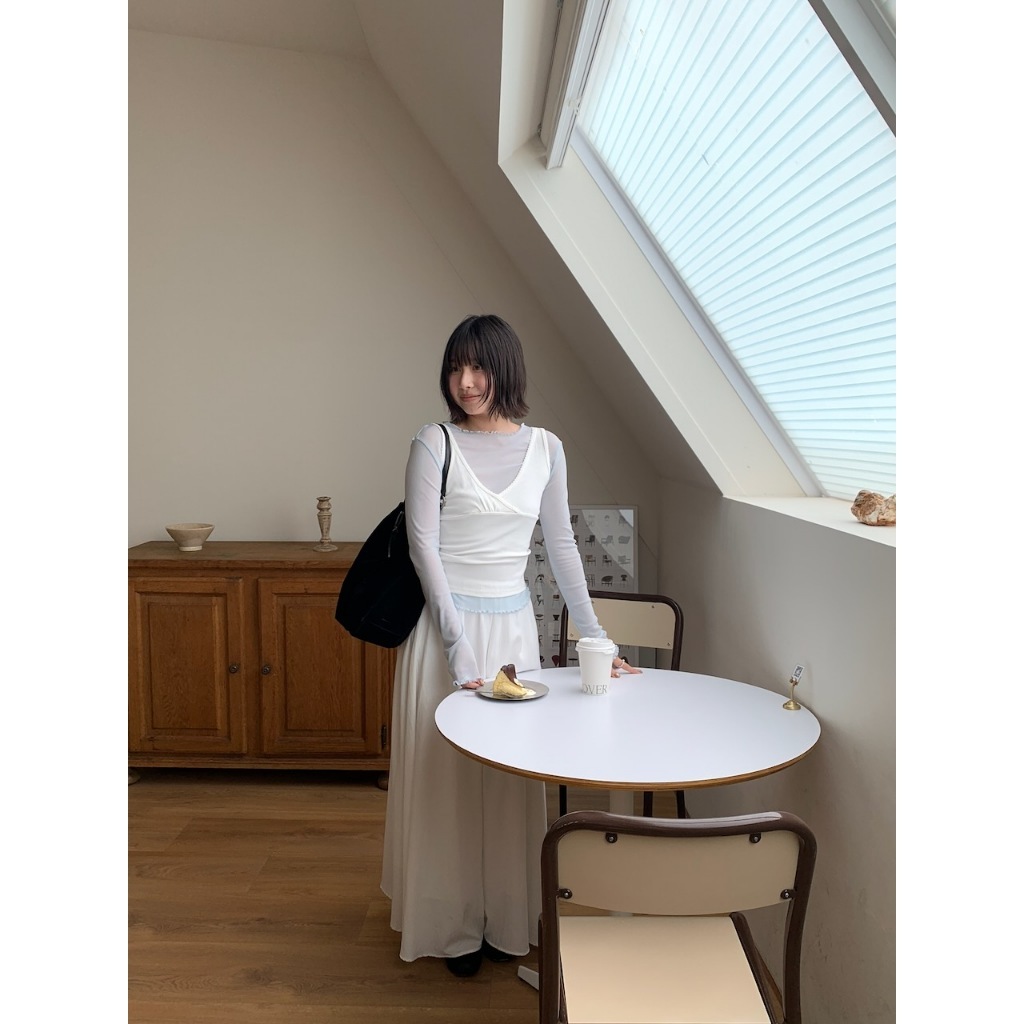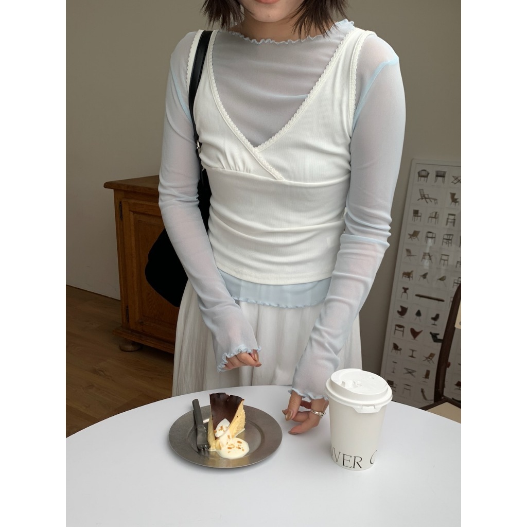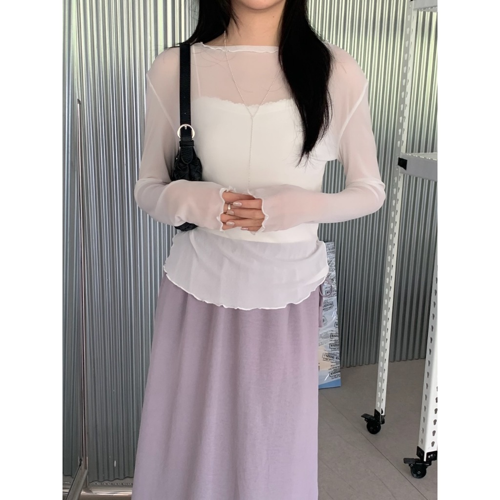 ※寬領 中長版 透膚滑順網紗 領口、下擺、手袖木耳邊設計 素色