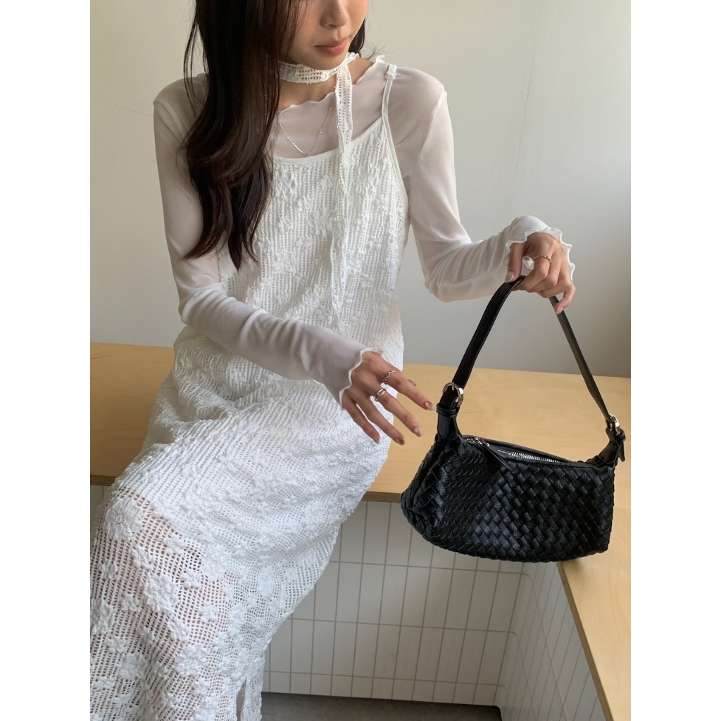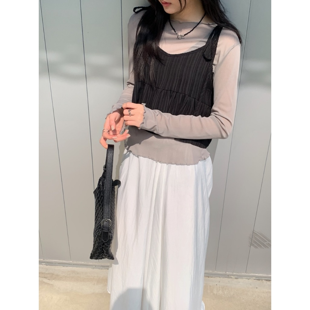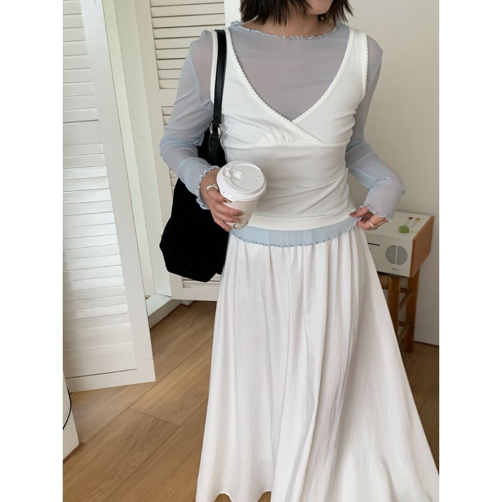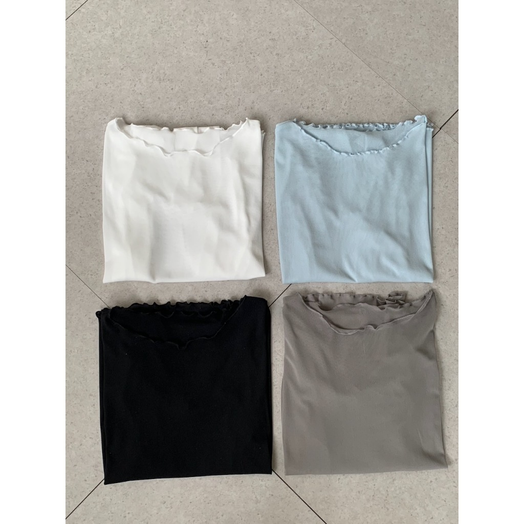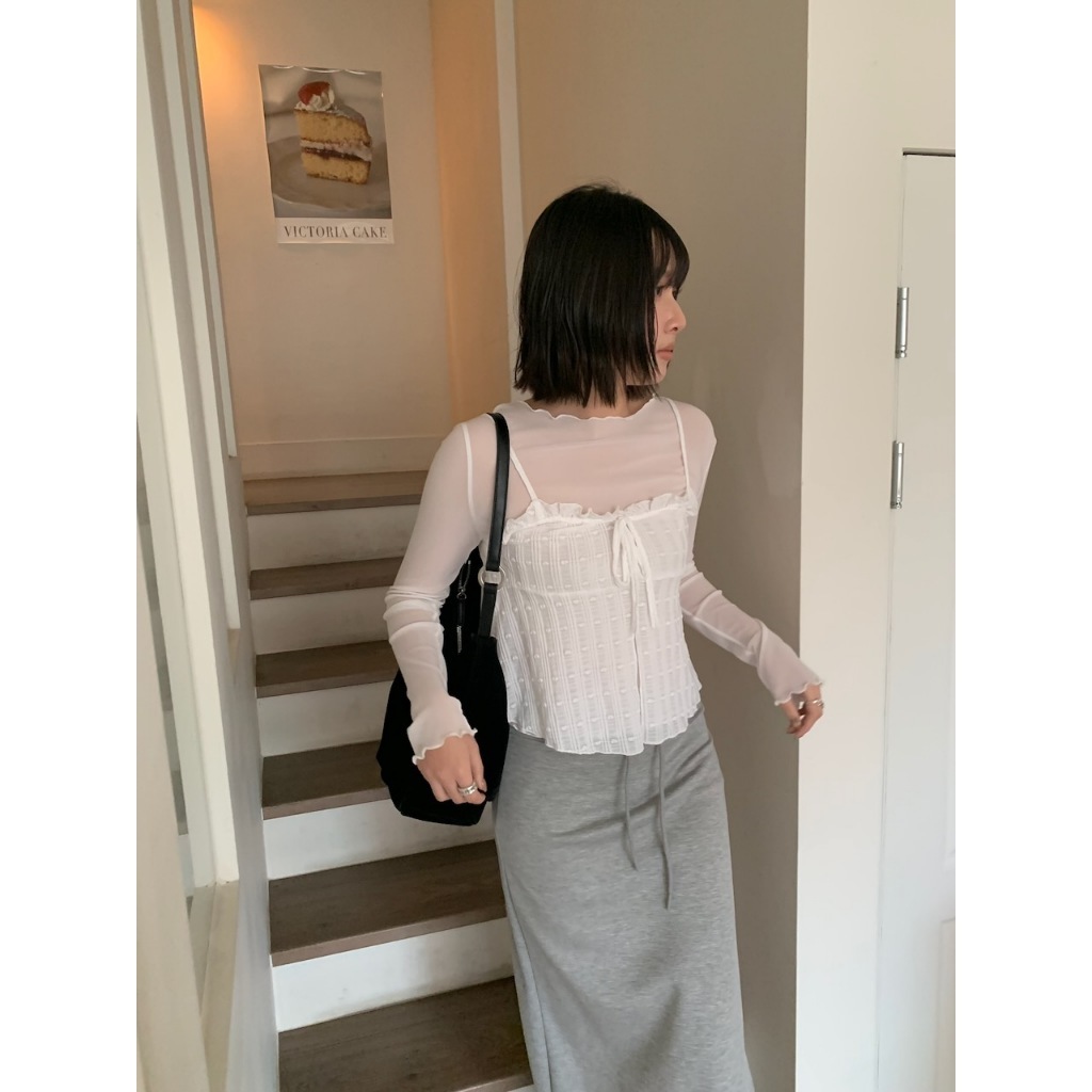 ※寬領 中長版 透膚滑順網紗 領口、下擺、手袖木耳邊設計 素色