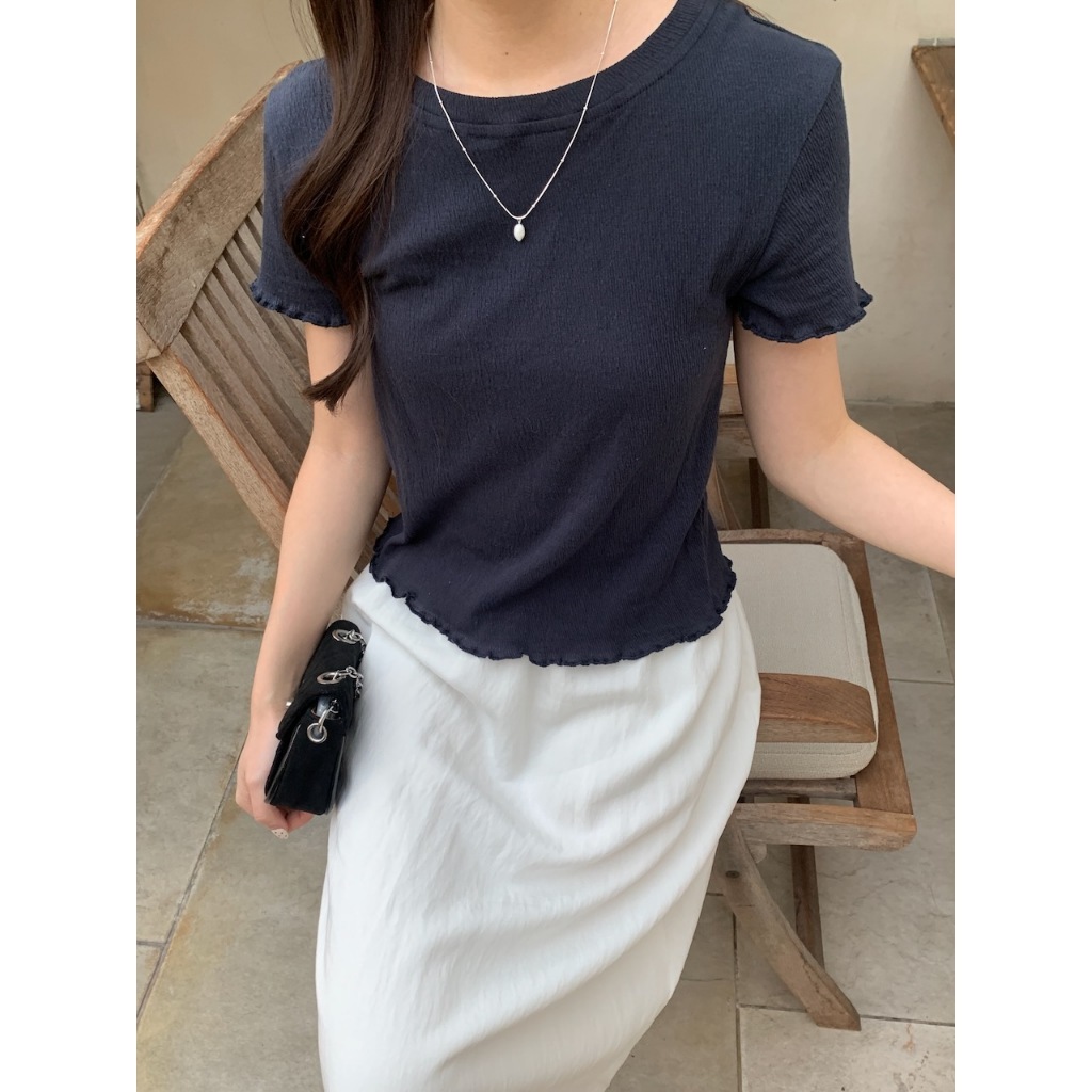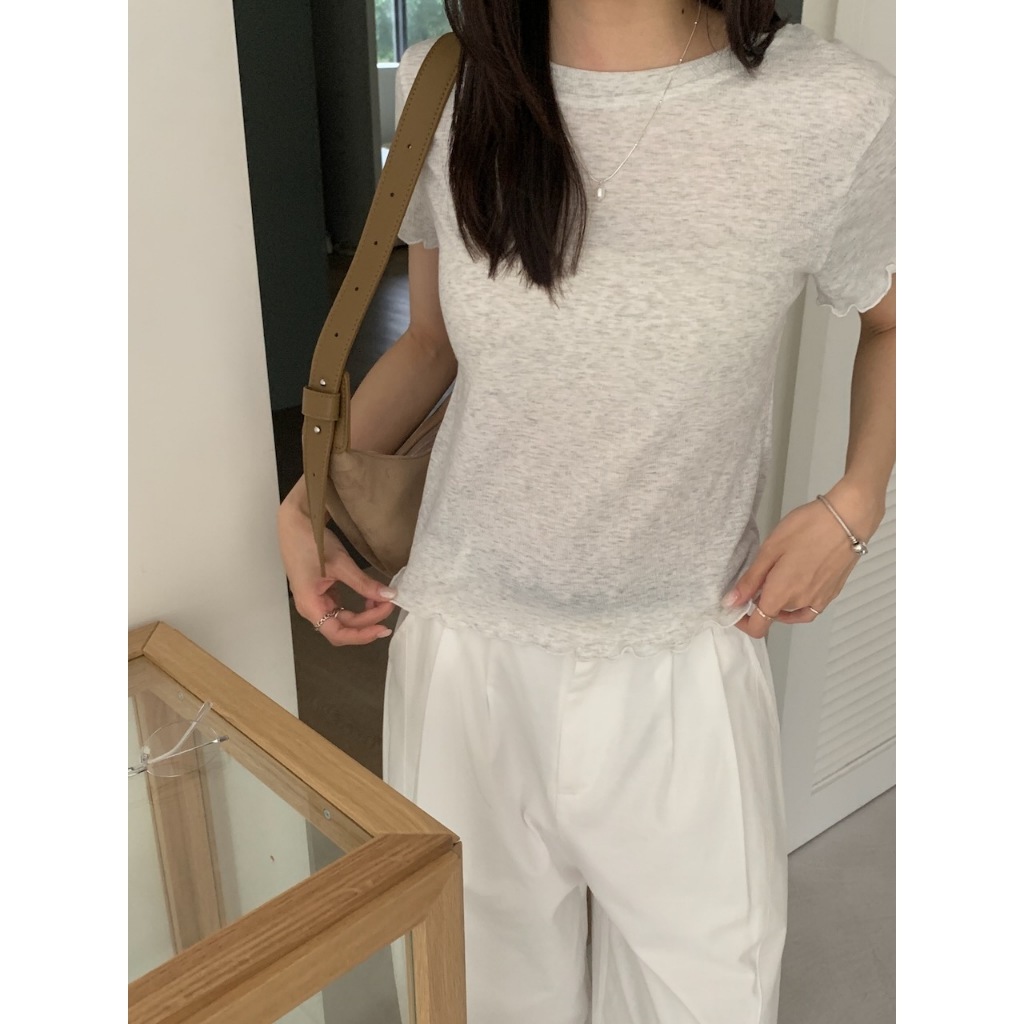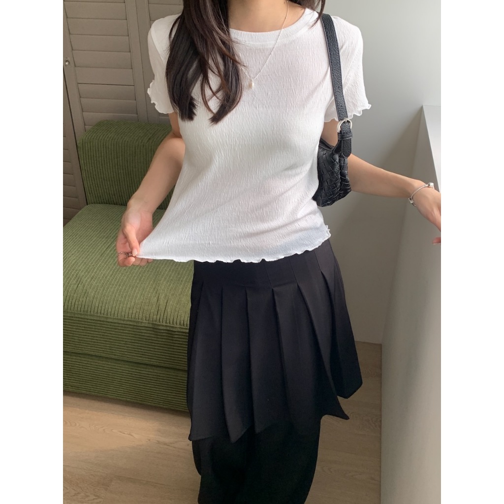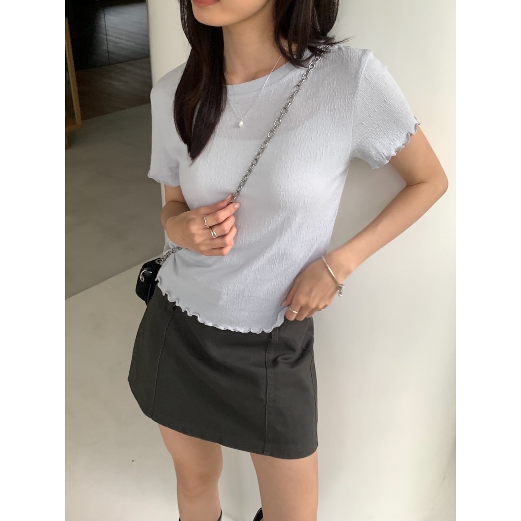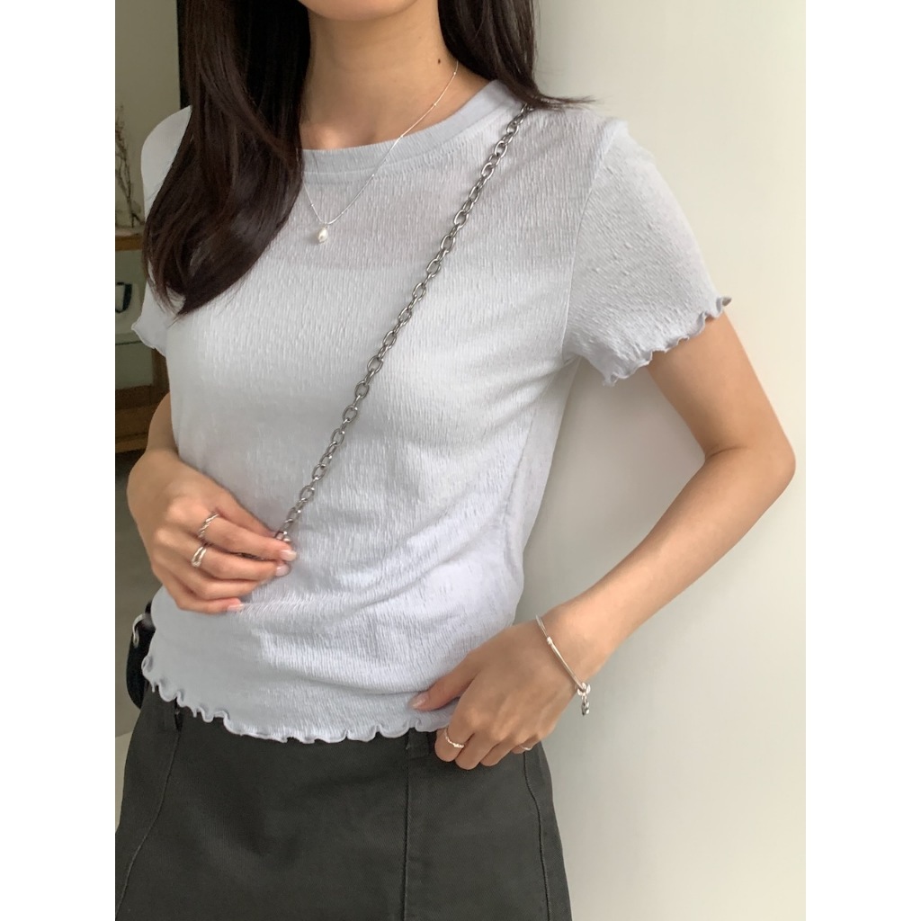 ※圓領 手袖、下擺木耳邊 長度遮肚 微立體皺皺紋紋路 很有彈性 微薄 素色
