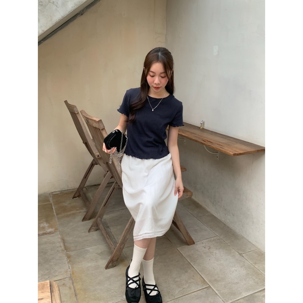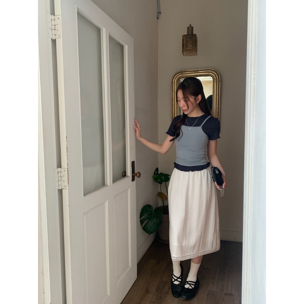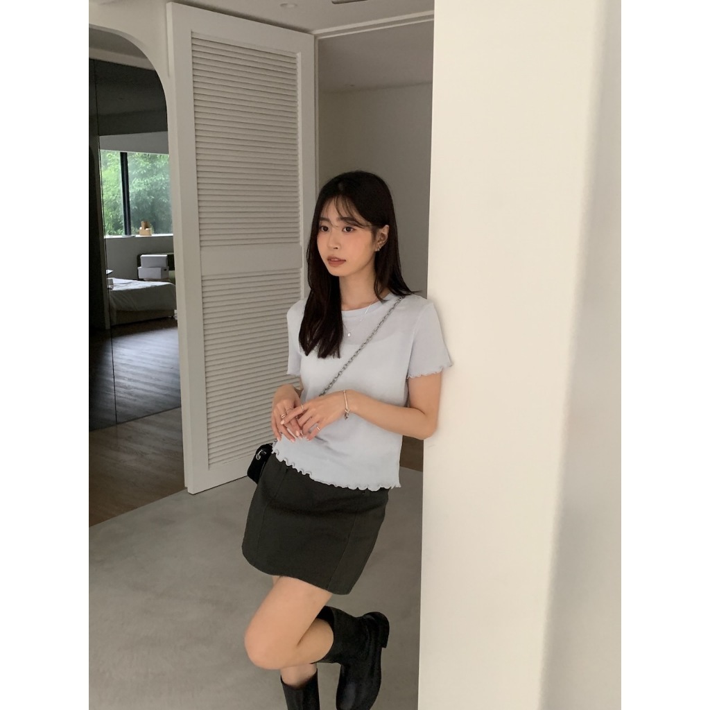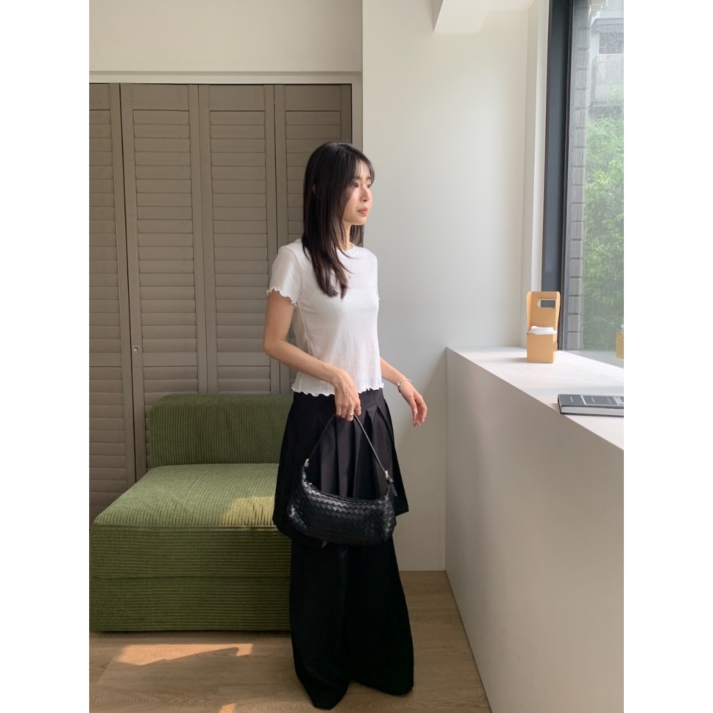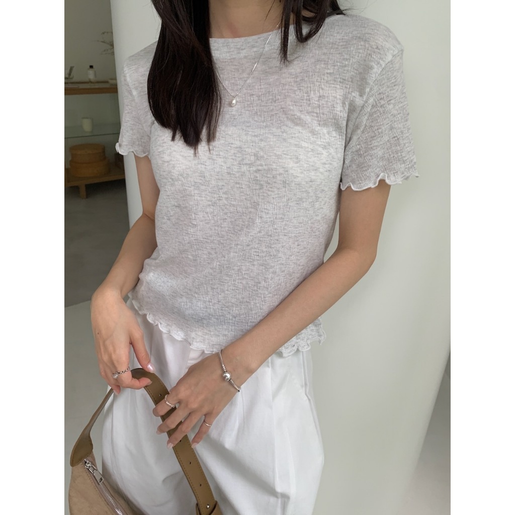 ※圓領 手袖、下擺木耳邊 長度遮肚 微立體皺皺紋紋路 很有彈性 微薄 素色