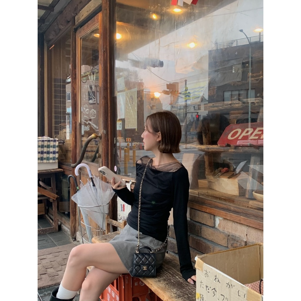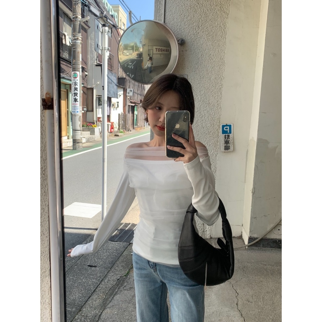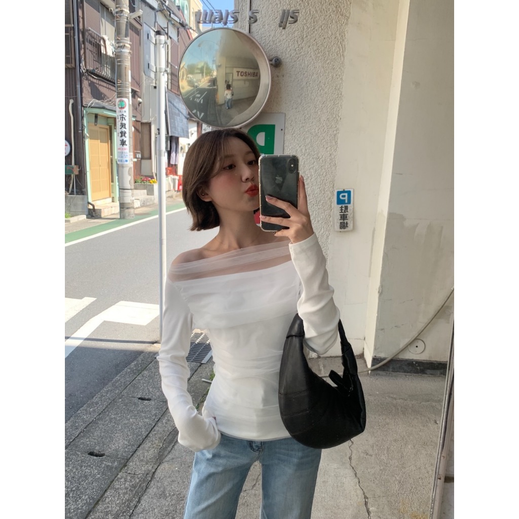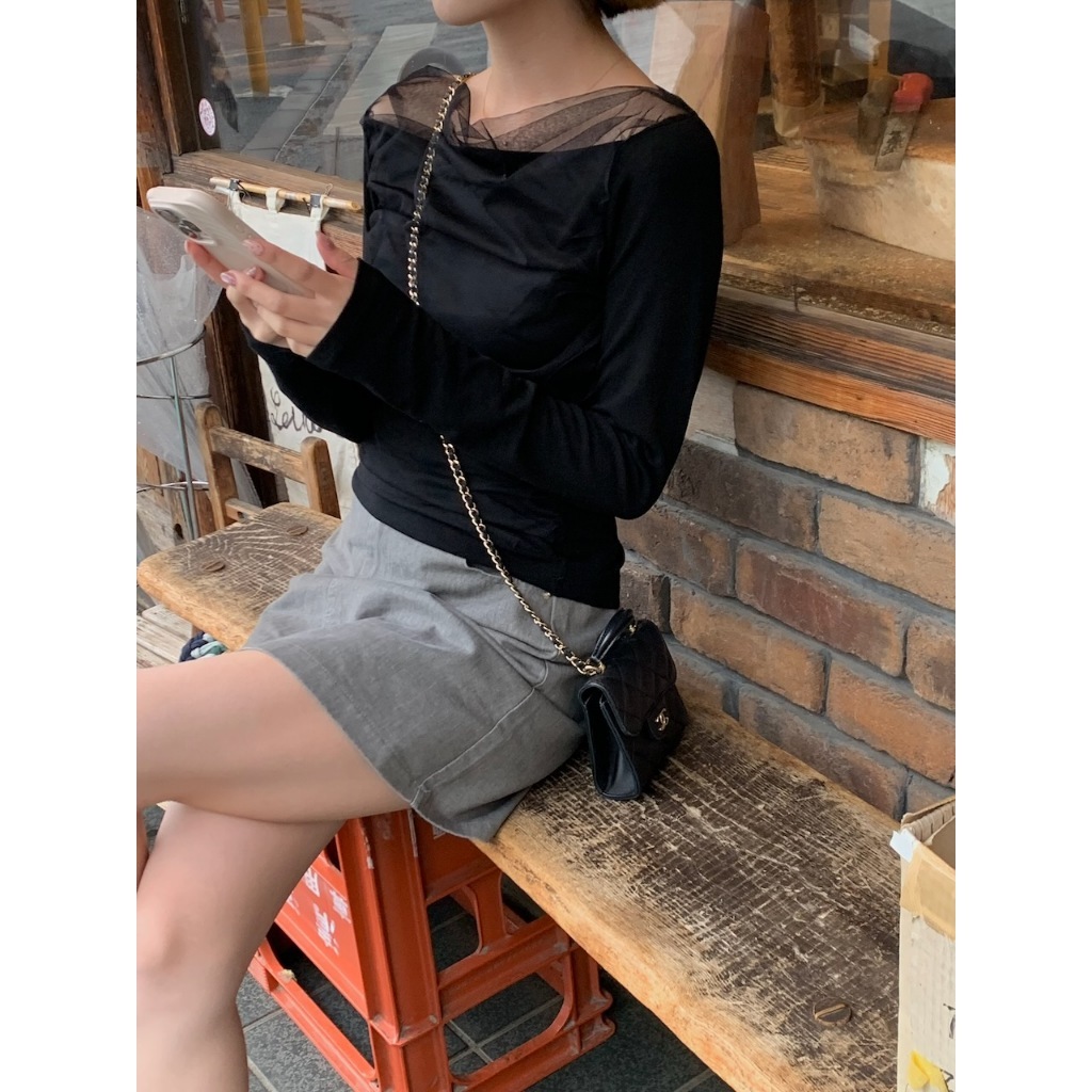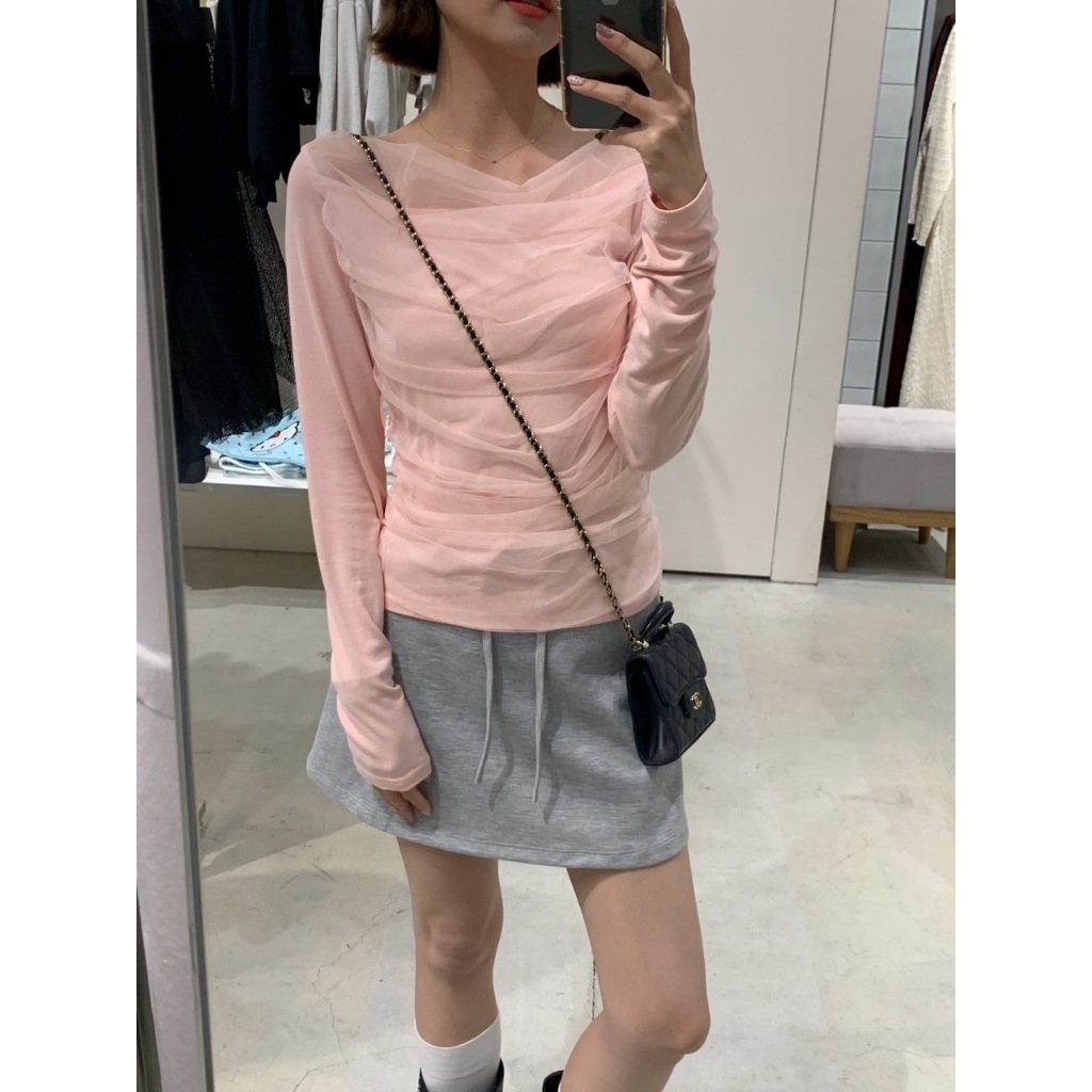 ※寬圓領長袖 前面固定式大片不規則網紗設計 中長版 版型微合身 有彈性