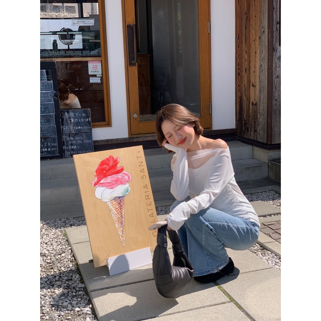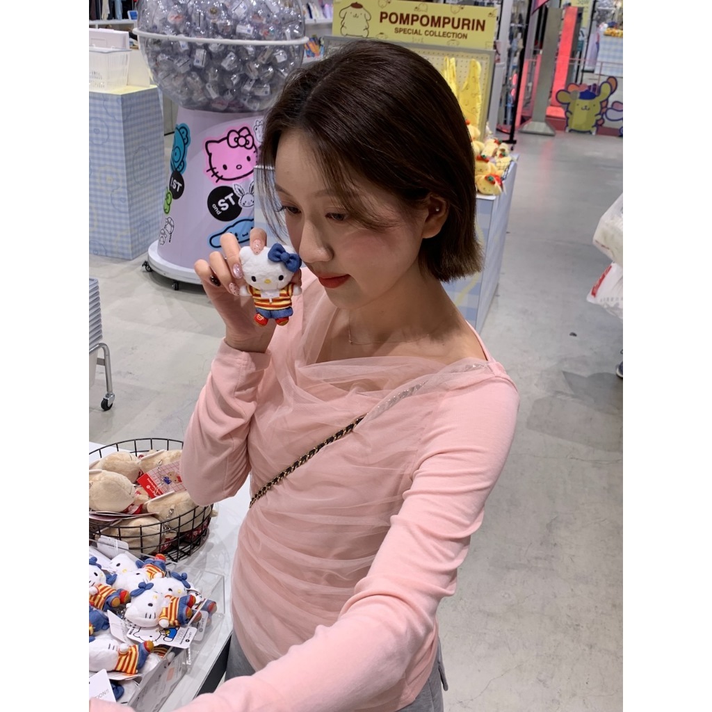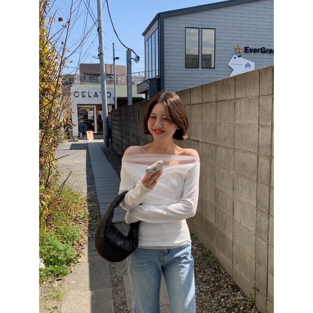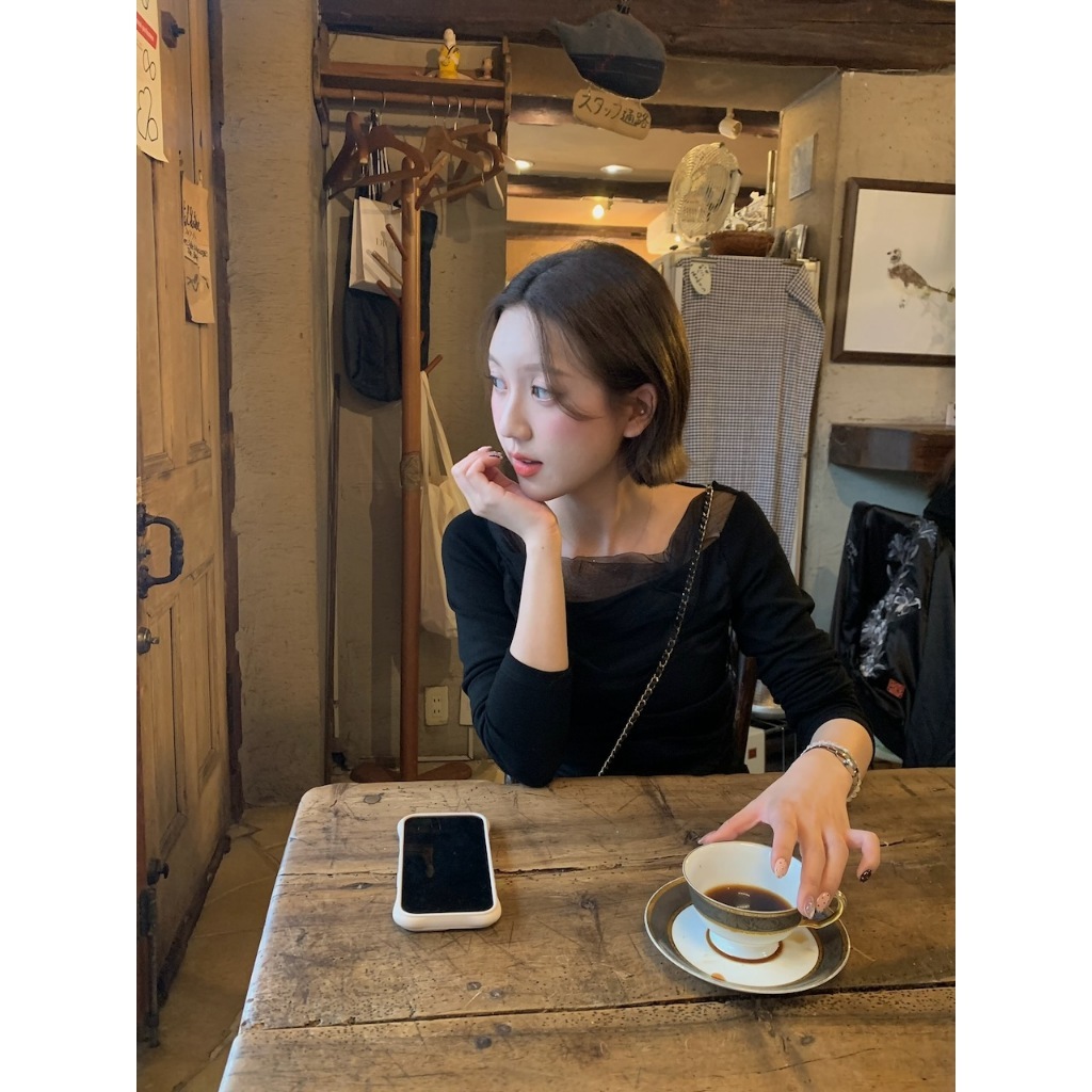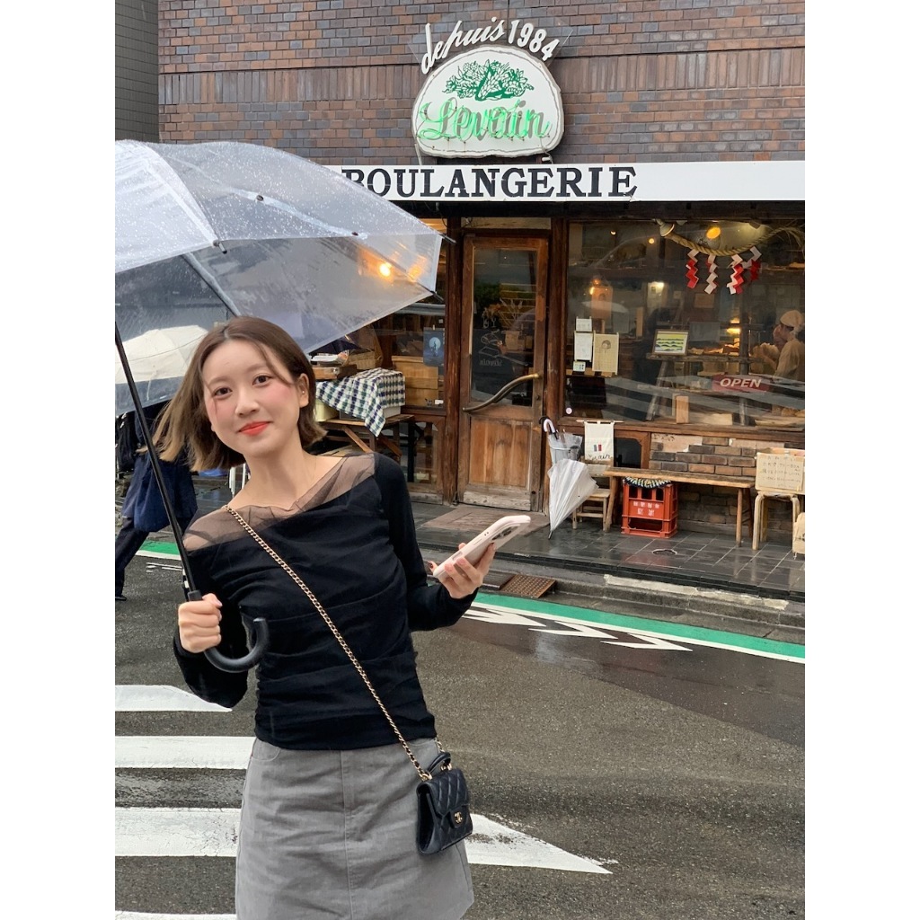 ※寬圓領長袖 前面固定式大片不規則網紗設計 中長版 版型微合身 有彈性