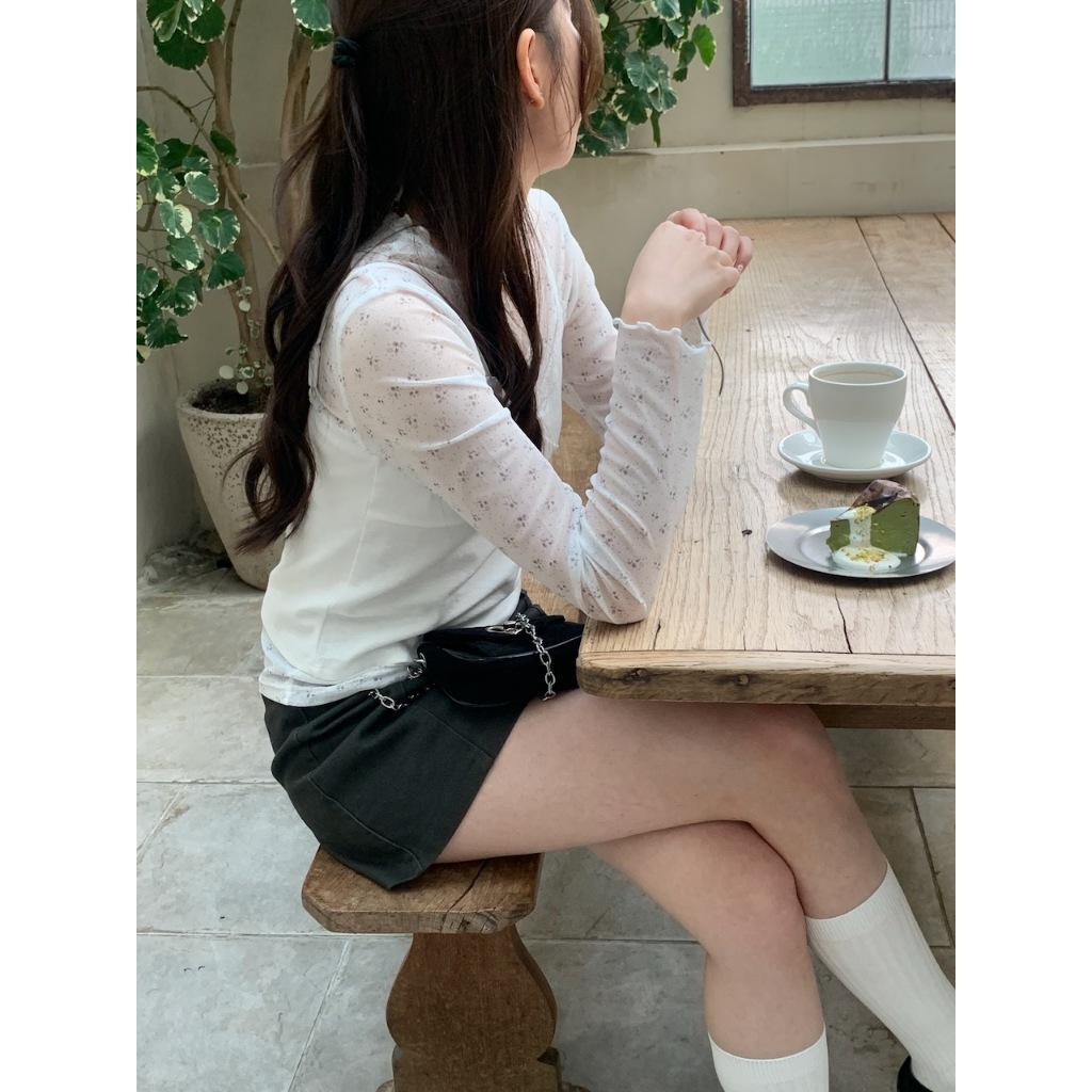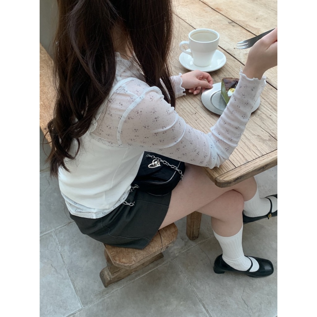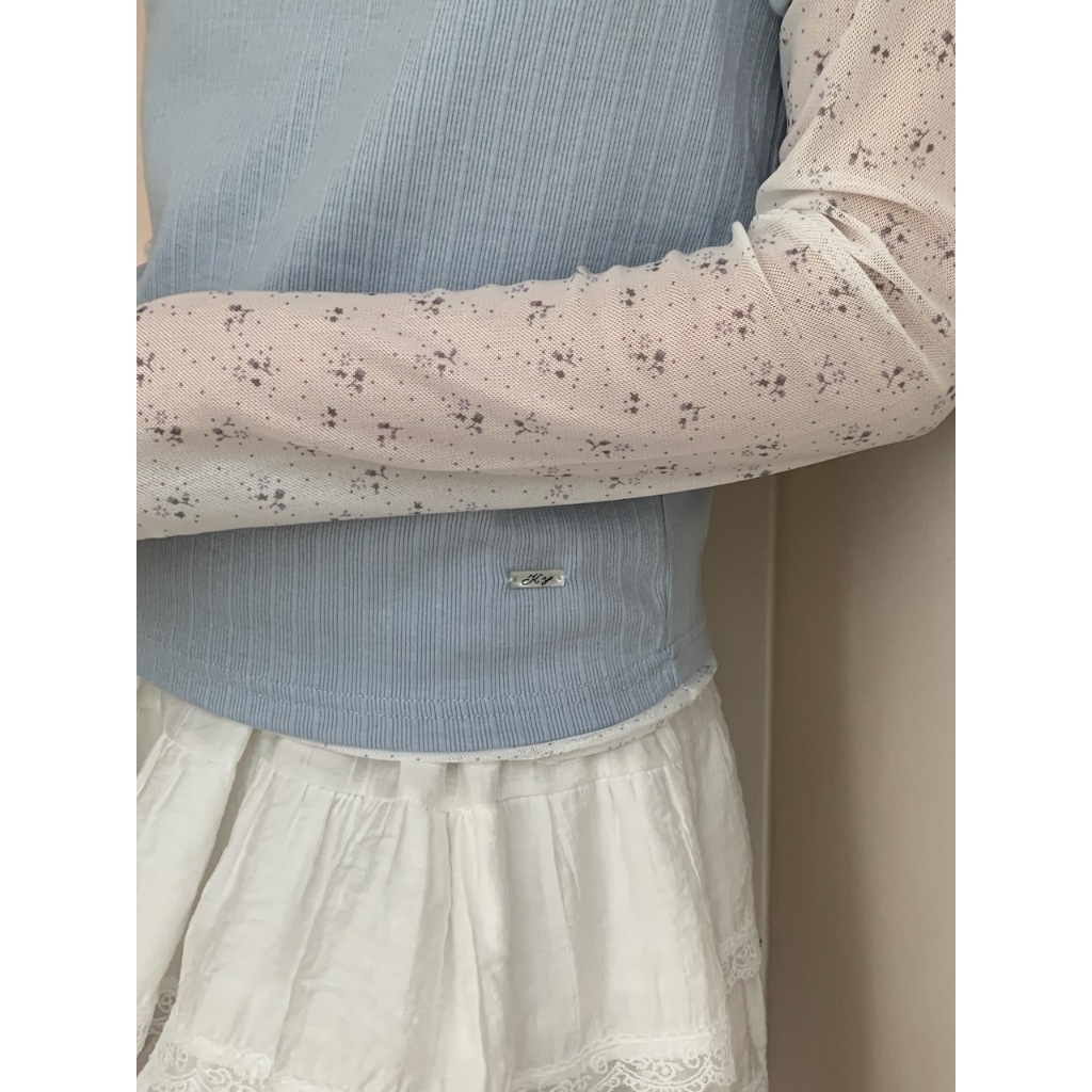 ※圓領 透膚網紗上衣 中長版 領口、手袖木耳邊 親膚柔軟 微彈性 - (碎花款) 滿版碎花樣式