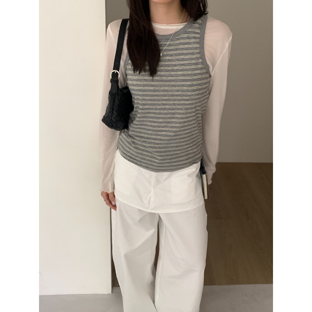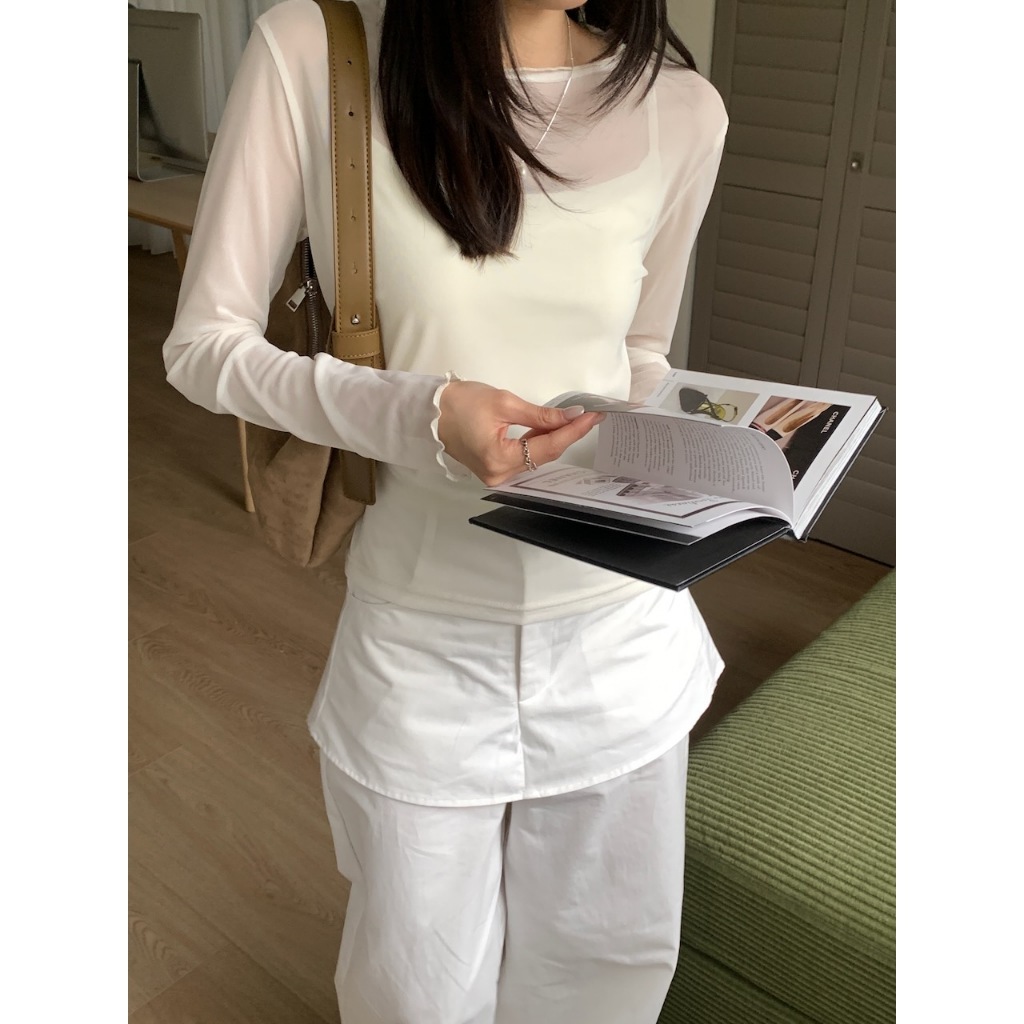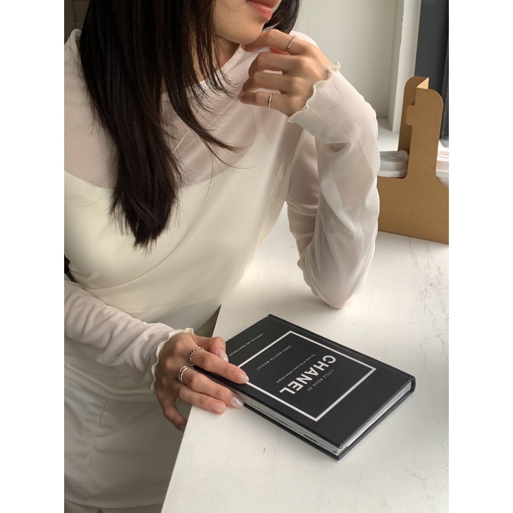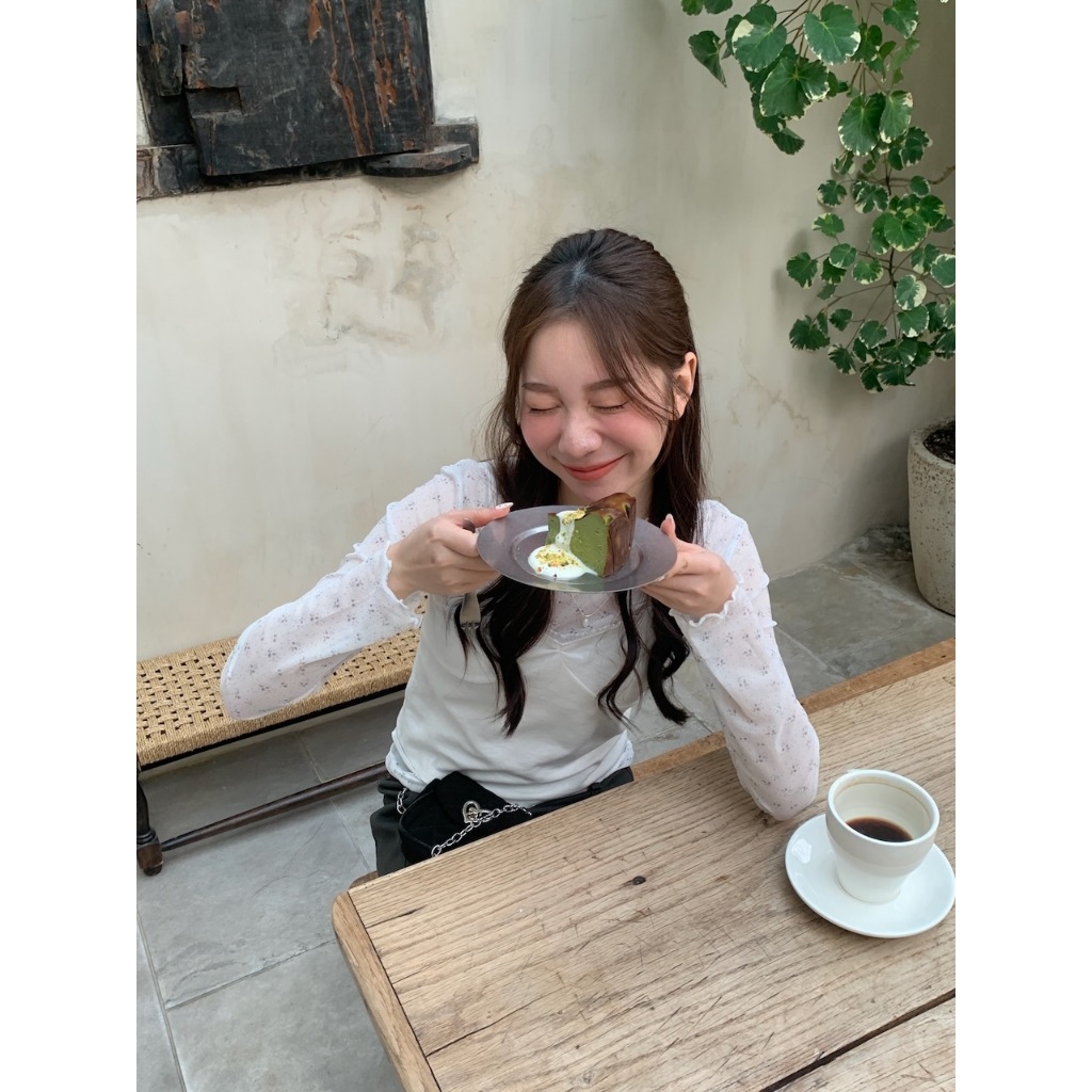 ※圓領 透膚網紗上衣 中長版 領口、手袖木耳邊 親膚柔軟 微彈性 - (碎花款) 滿版碎花樣式