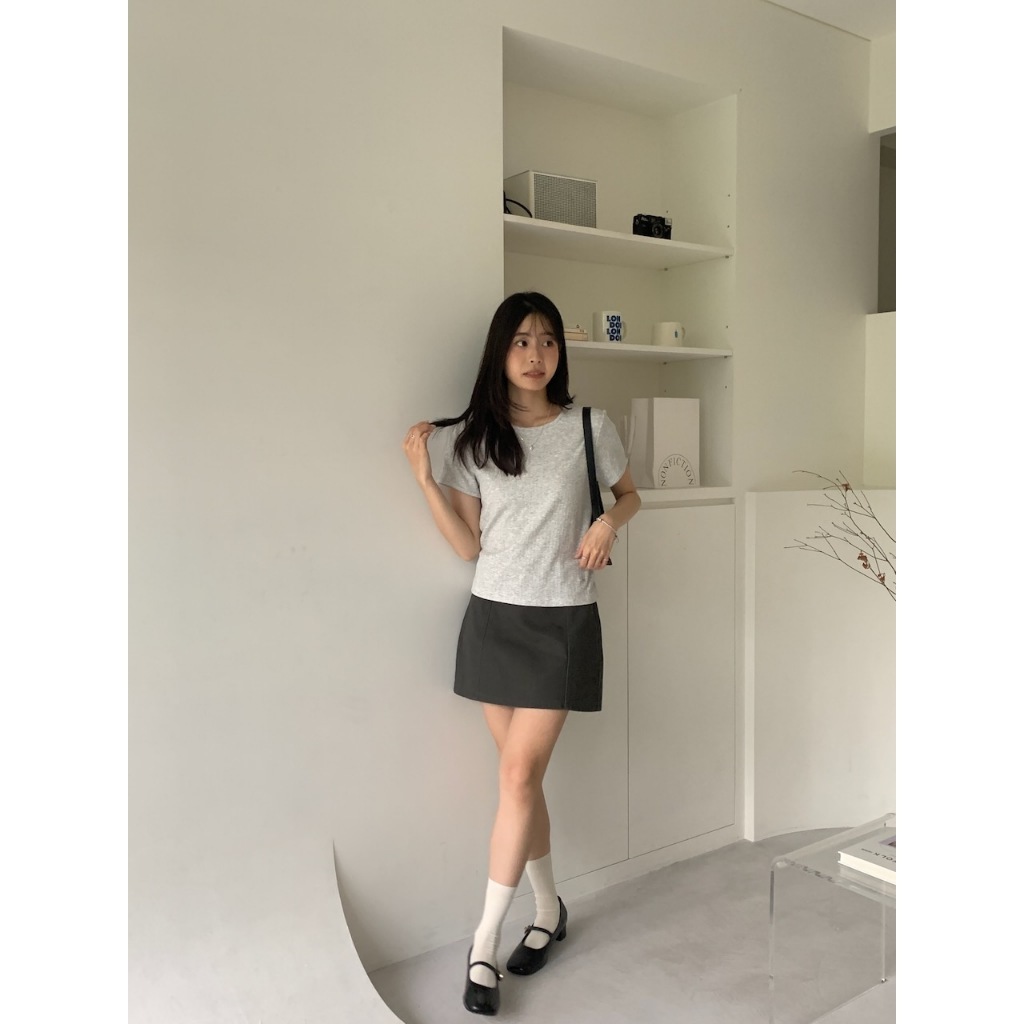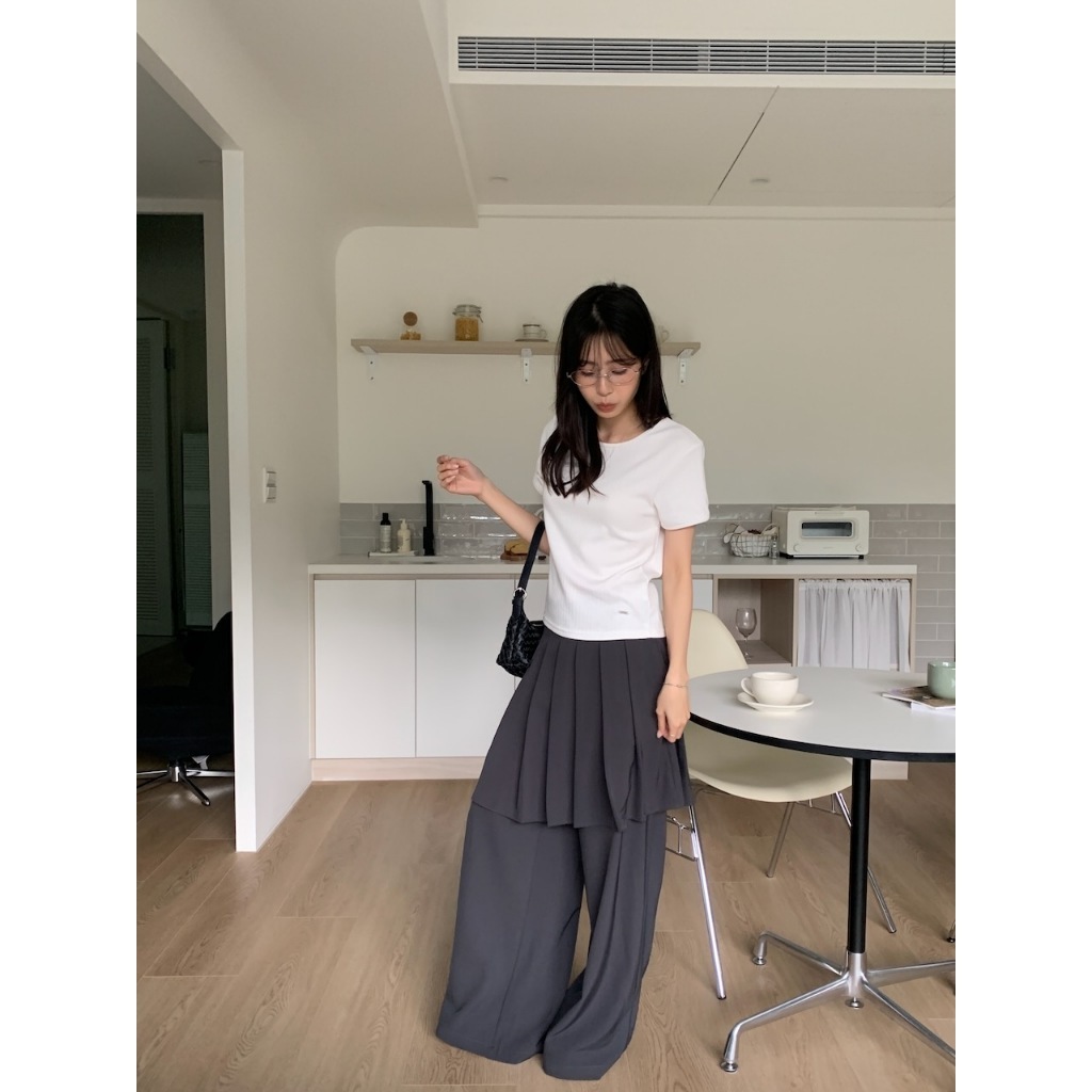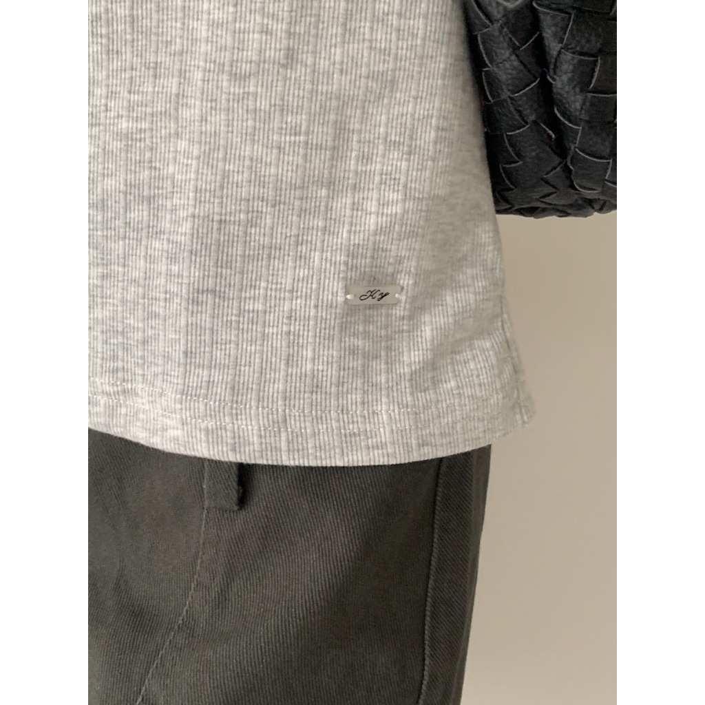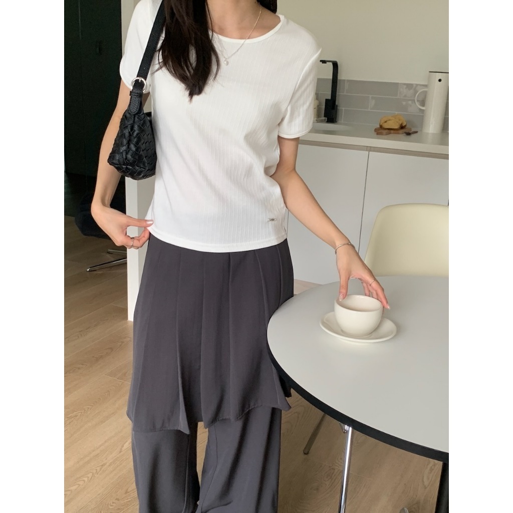 ※圓領 短袖 整件直條紋紋路 右下貝殼小飾扣 有彈性 微合身 素色 微透