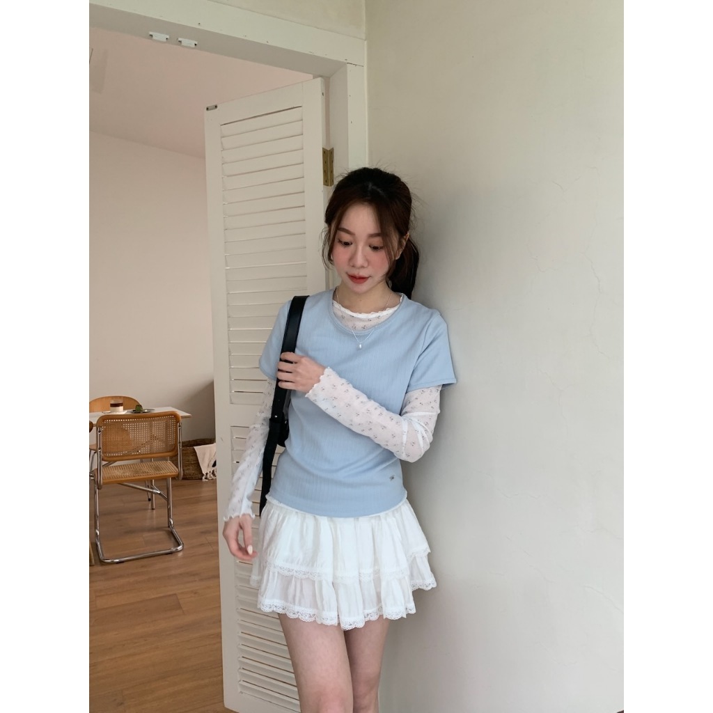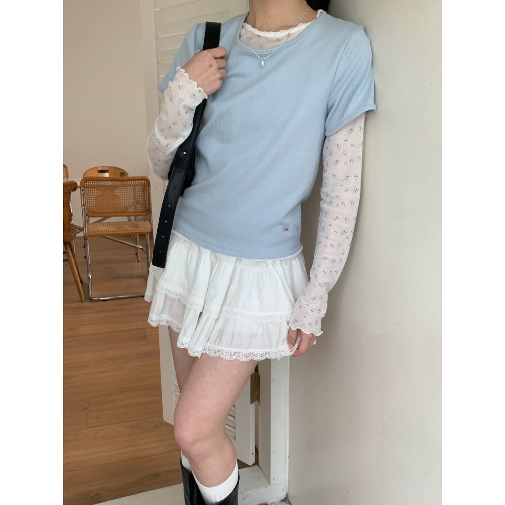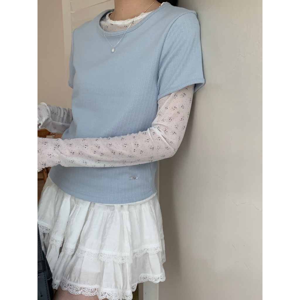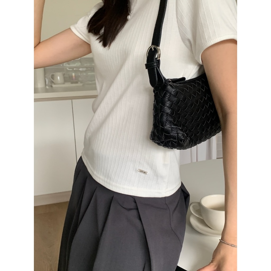 ※圓領 短袖 整件直條紋紋路 右下貝殼小飾扣 有彈性 微合身 素色 微透