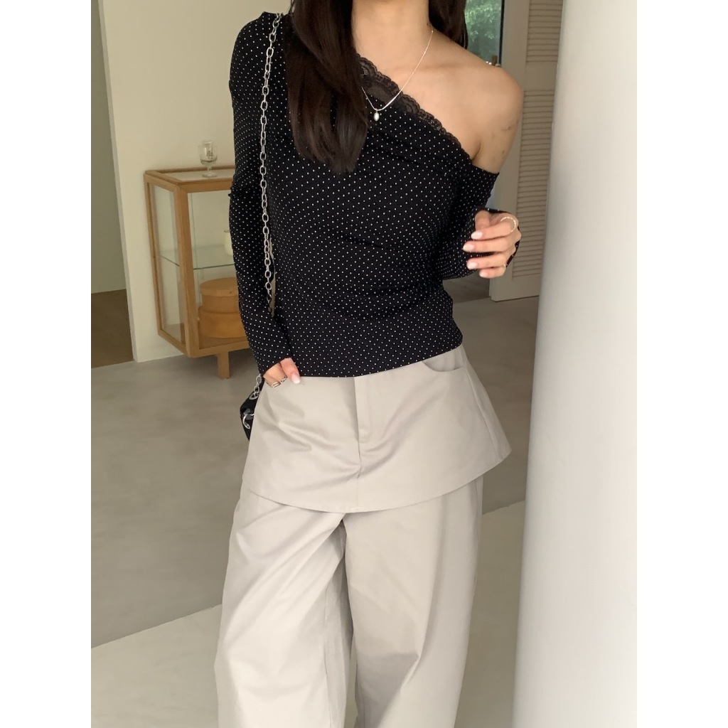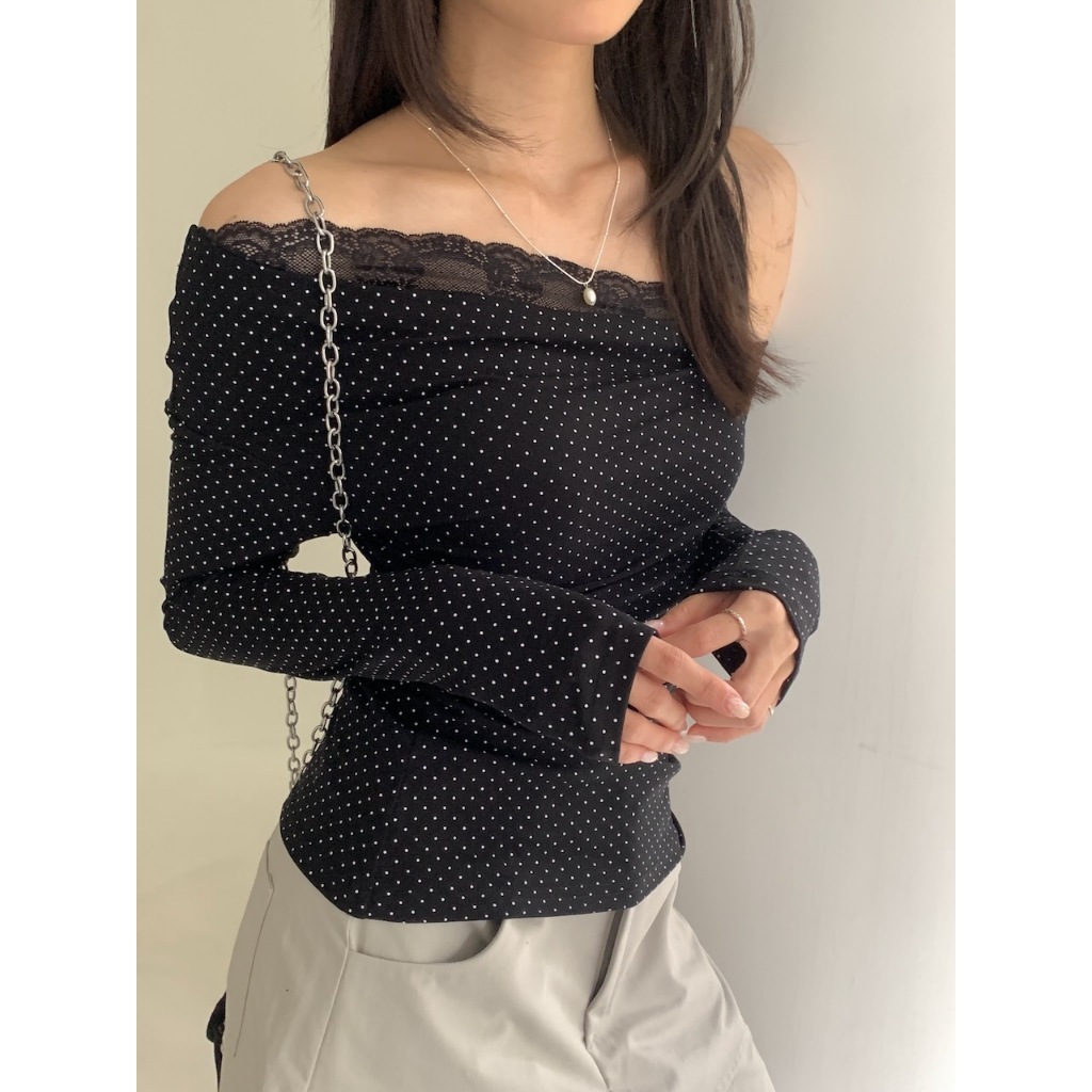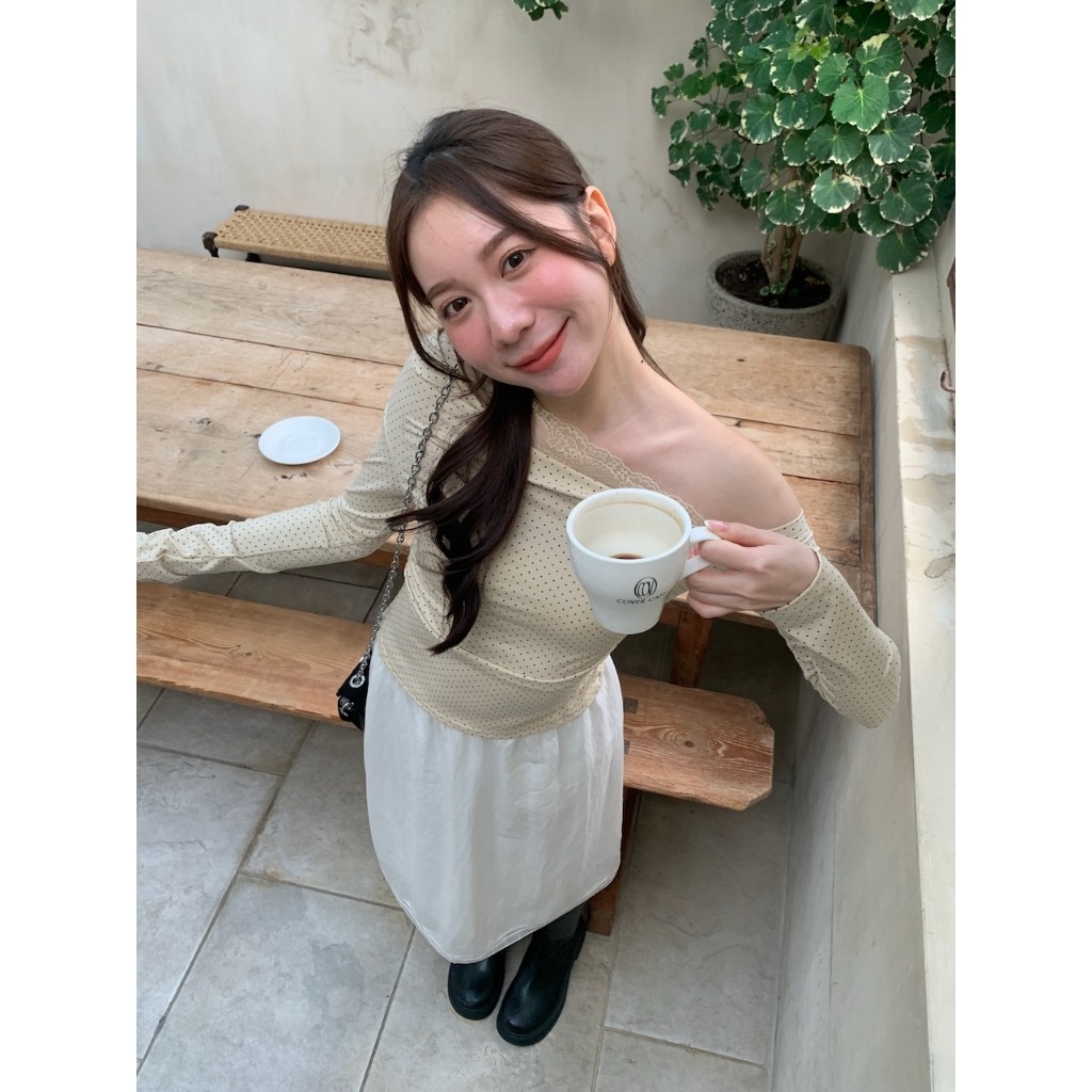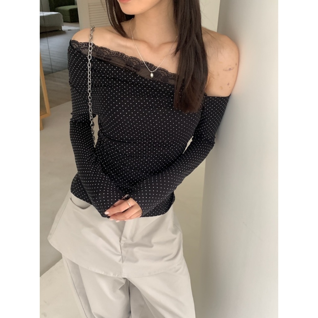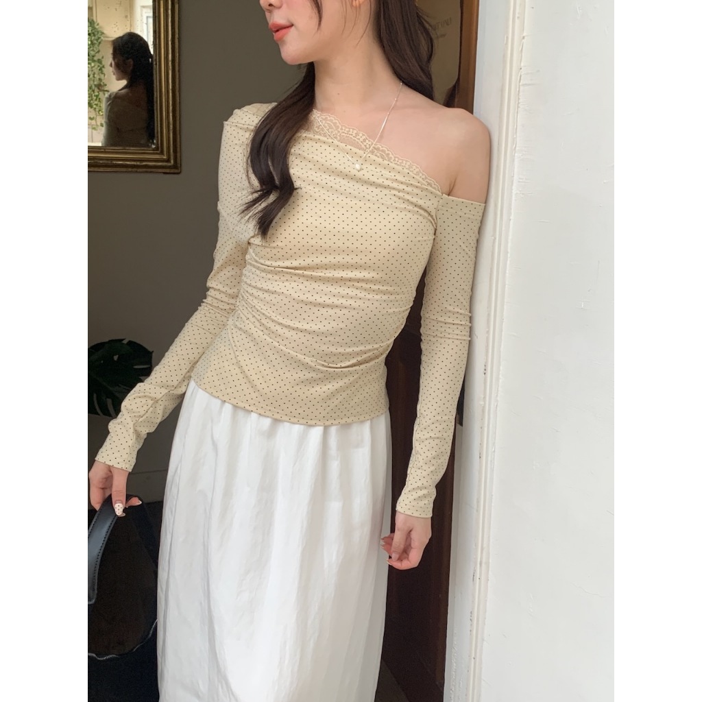 ※斜肩長袖合身棉上衣 滿版小圓點 前領口一片蕾絲花邊設計 左右兩側縮腰 有彈性