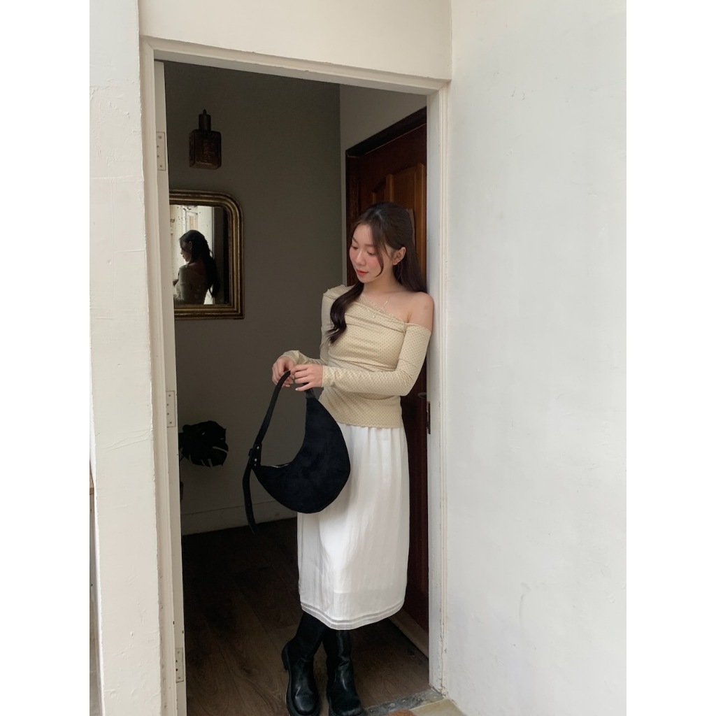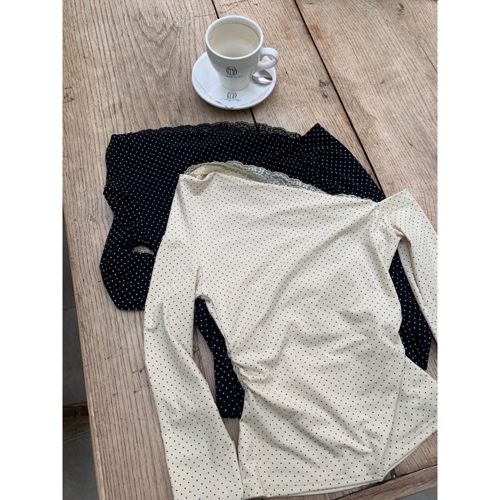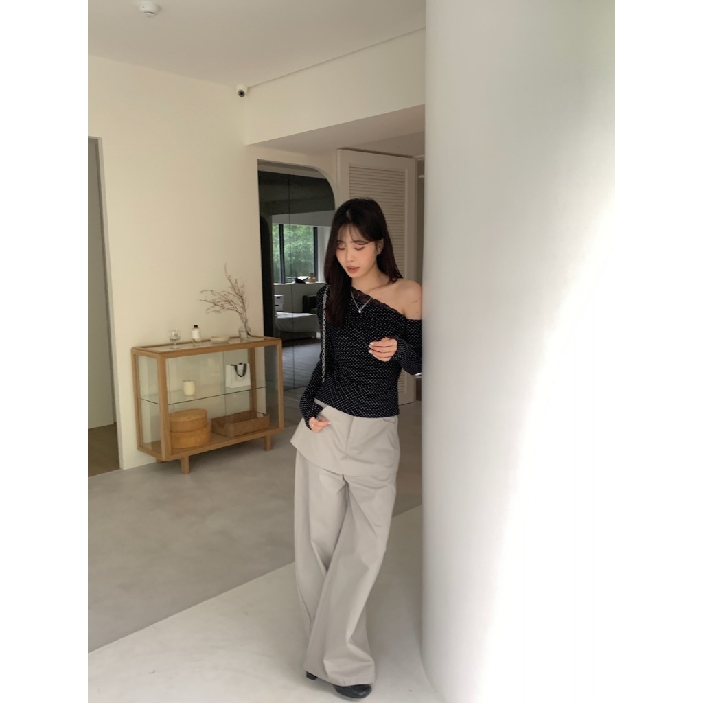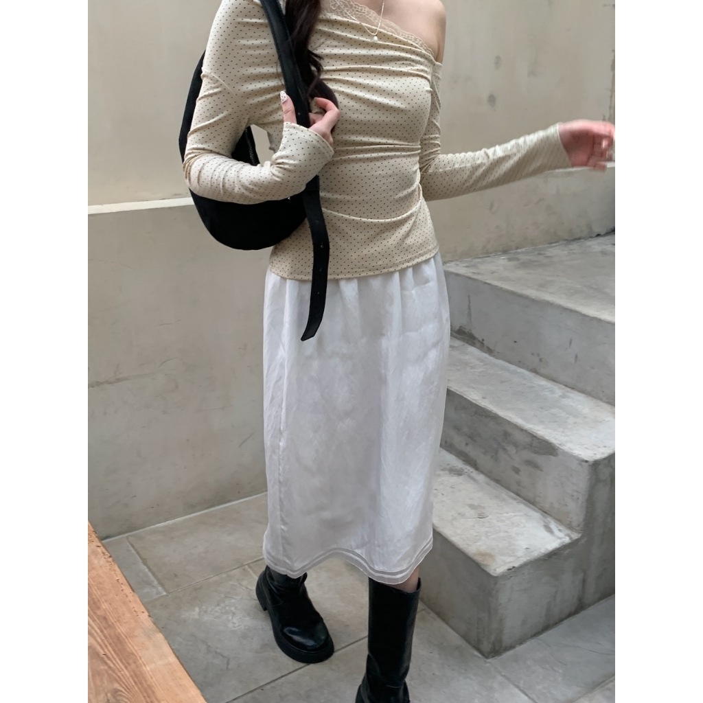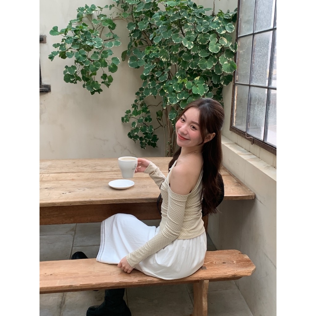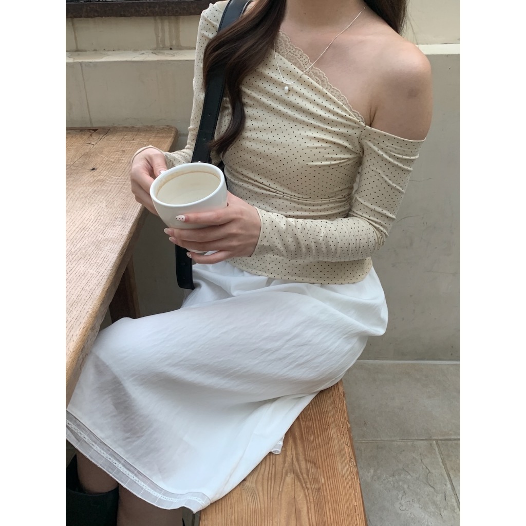 ※斜肩長袖合身棉上衣 滿版小圓點 前領口一片蕾絲花邊設計 左右兩側縮腰 有彈性