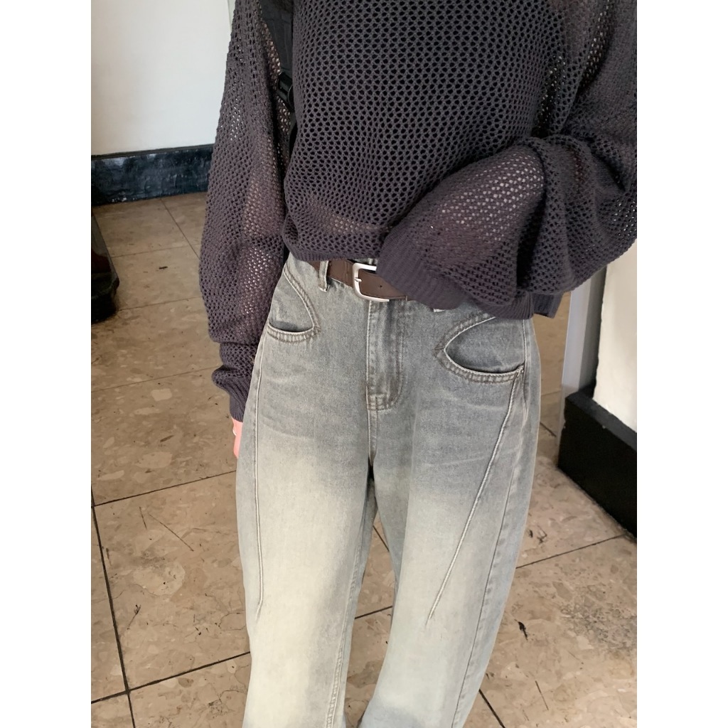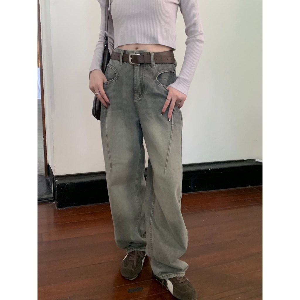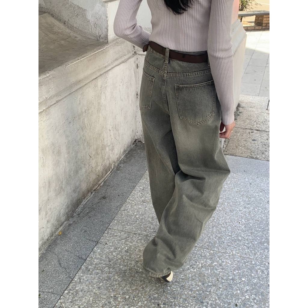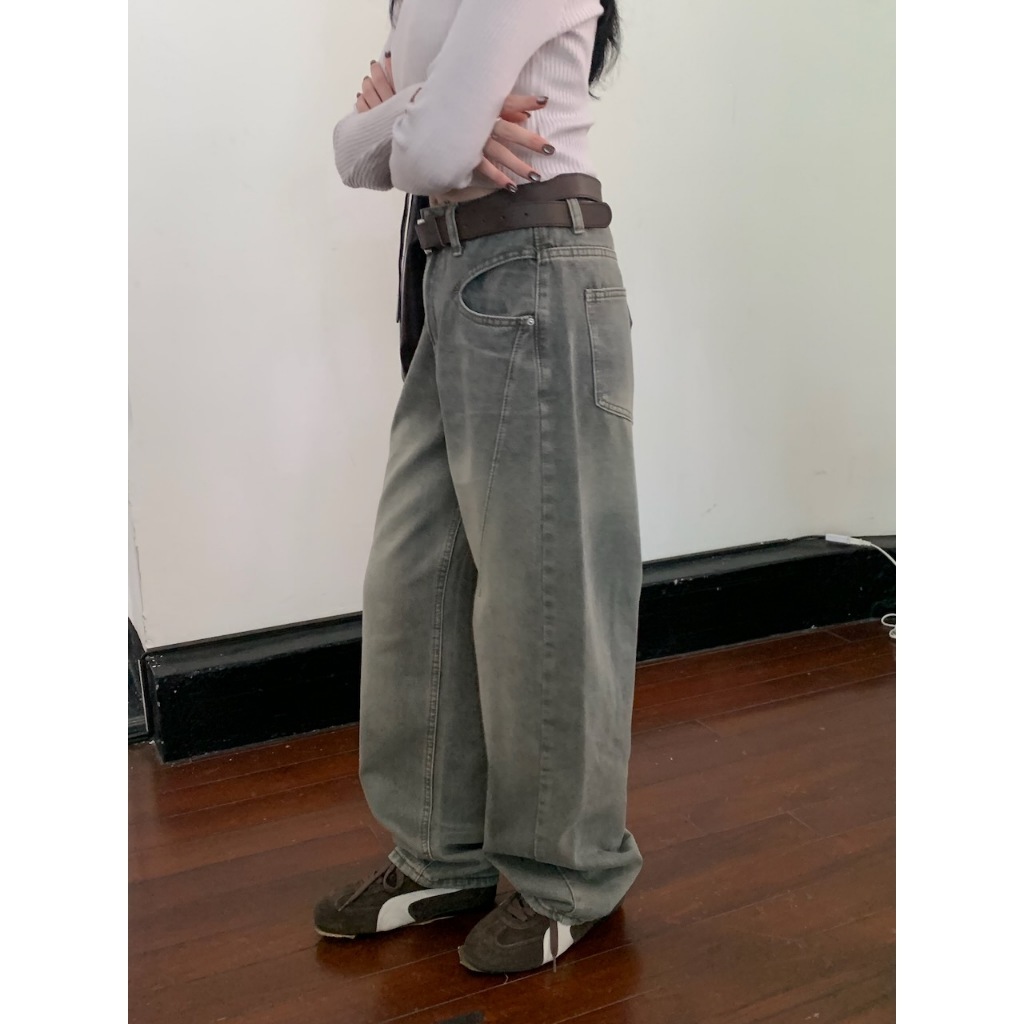※繭型牛仔寬褲 前面兩邊U型設計真口袋 後面真雙口袋 刷色 附可調節皮帶