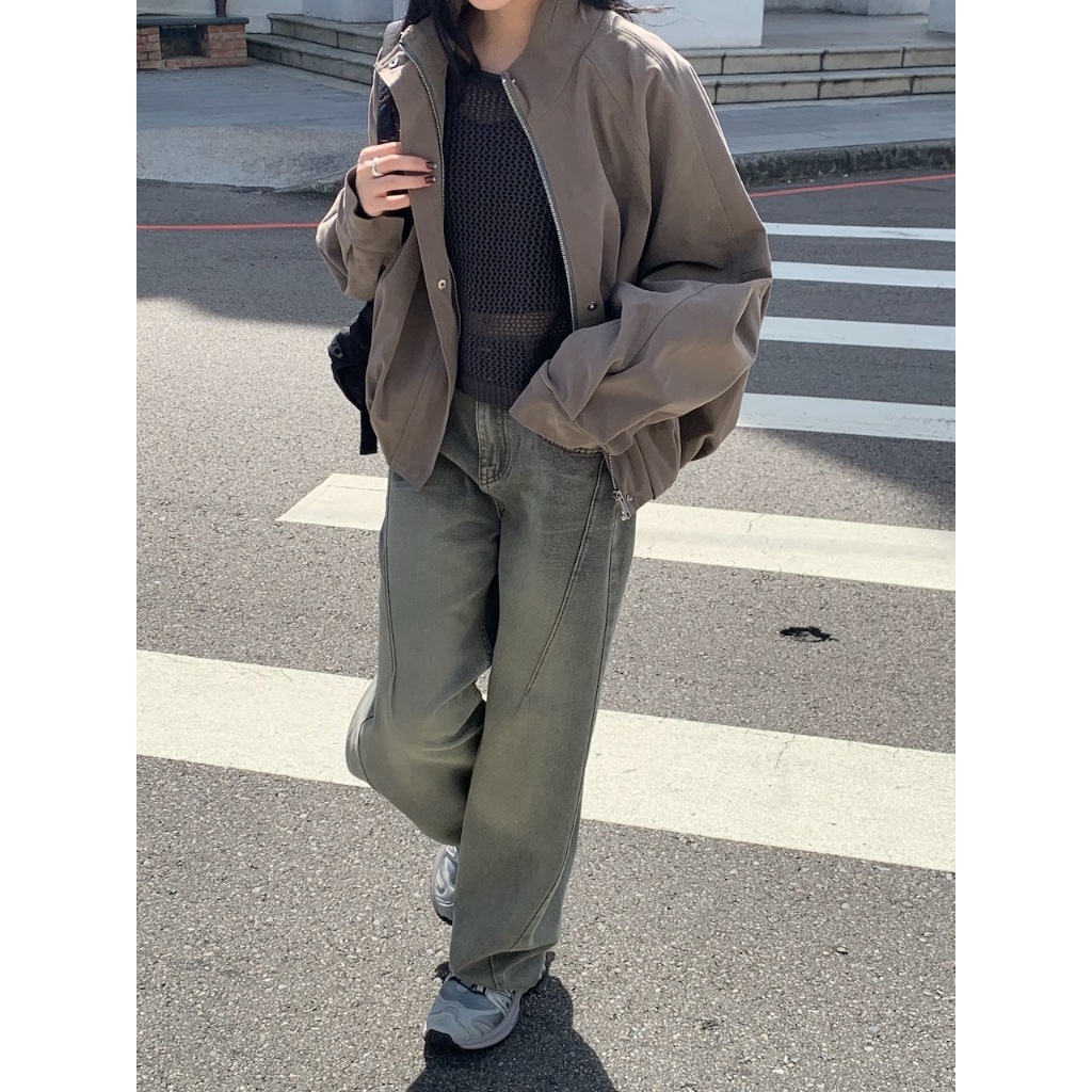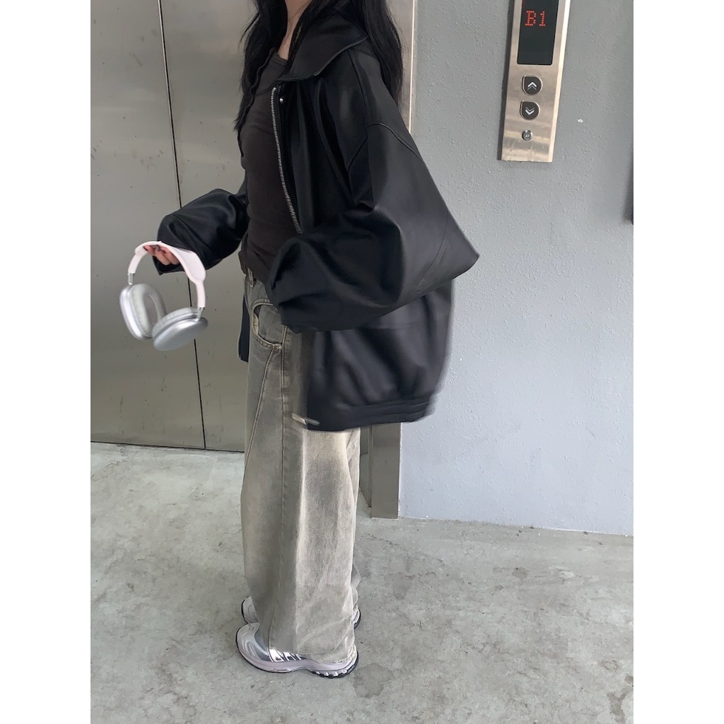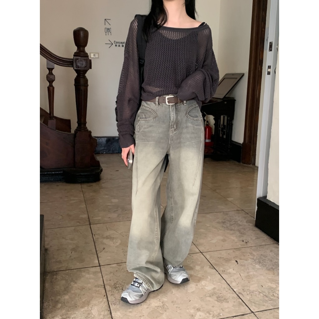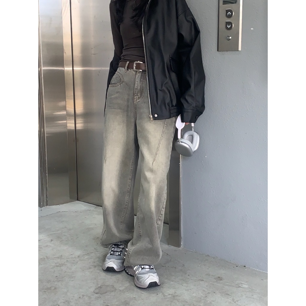 ※繭型牛仔寬褲 前面兩邊U型設計真口袋 後面真雙口袋 刷色 附可調節皮帶