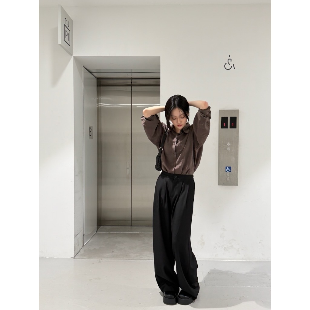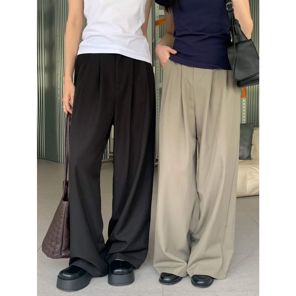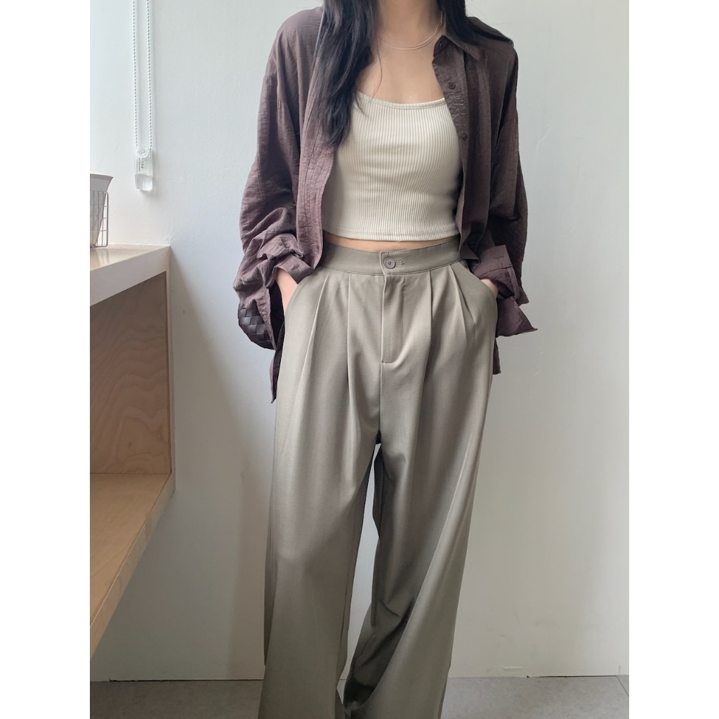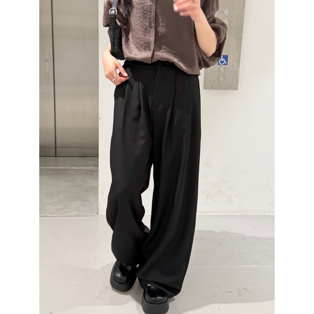 ※寬直筒西裝褲 前面壓摺線設計 前面兩側真雙口袋 真鈕扣拉鍊式 後腰縮口