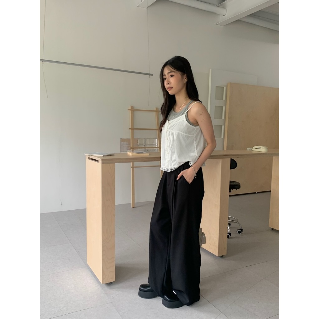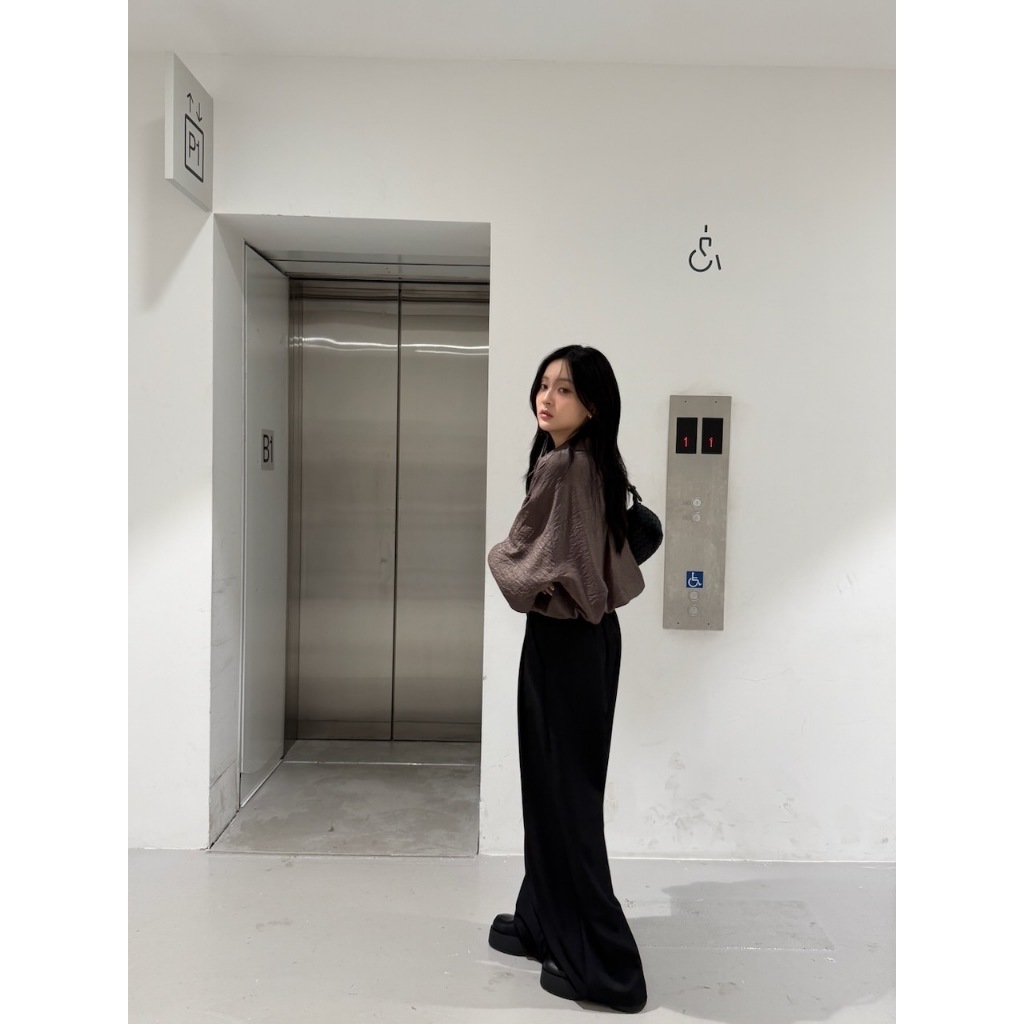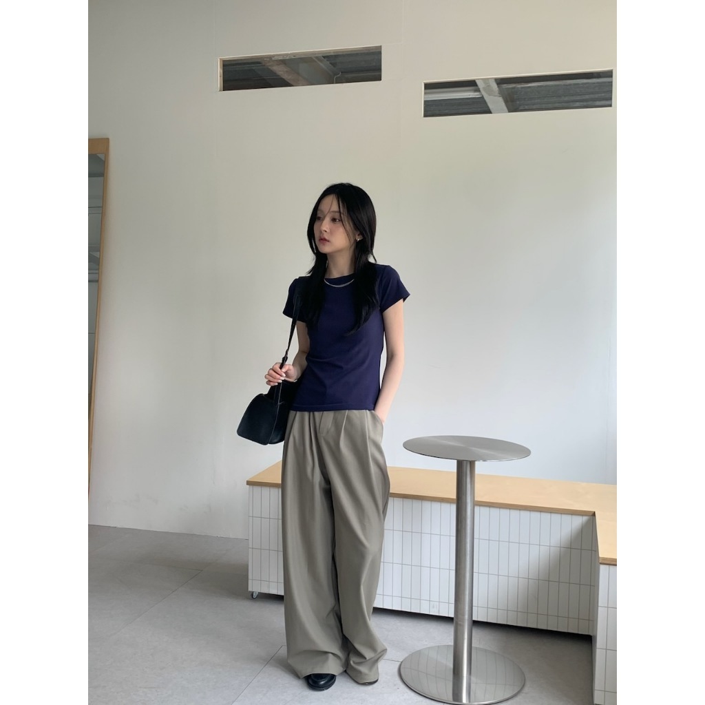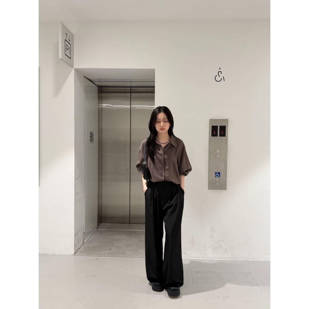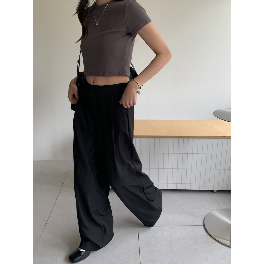 ※寬直筒西裝褲 前面壓摺線設計 前面兩側真雙口袋 真鈕扣拉鍊式 後腰縮口