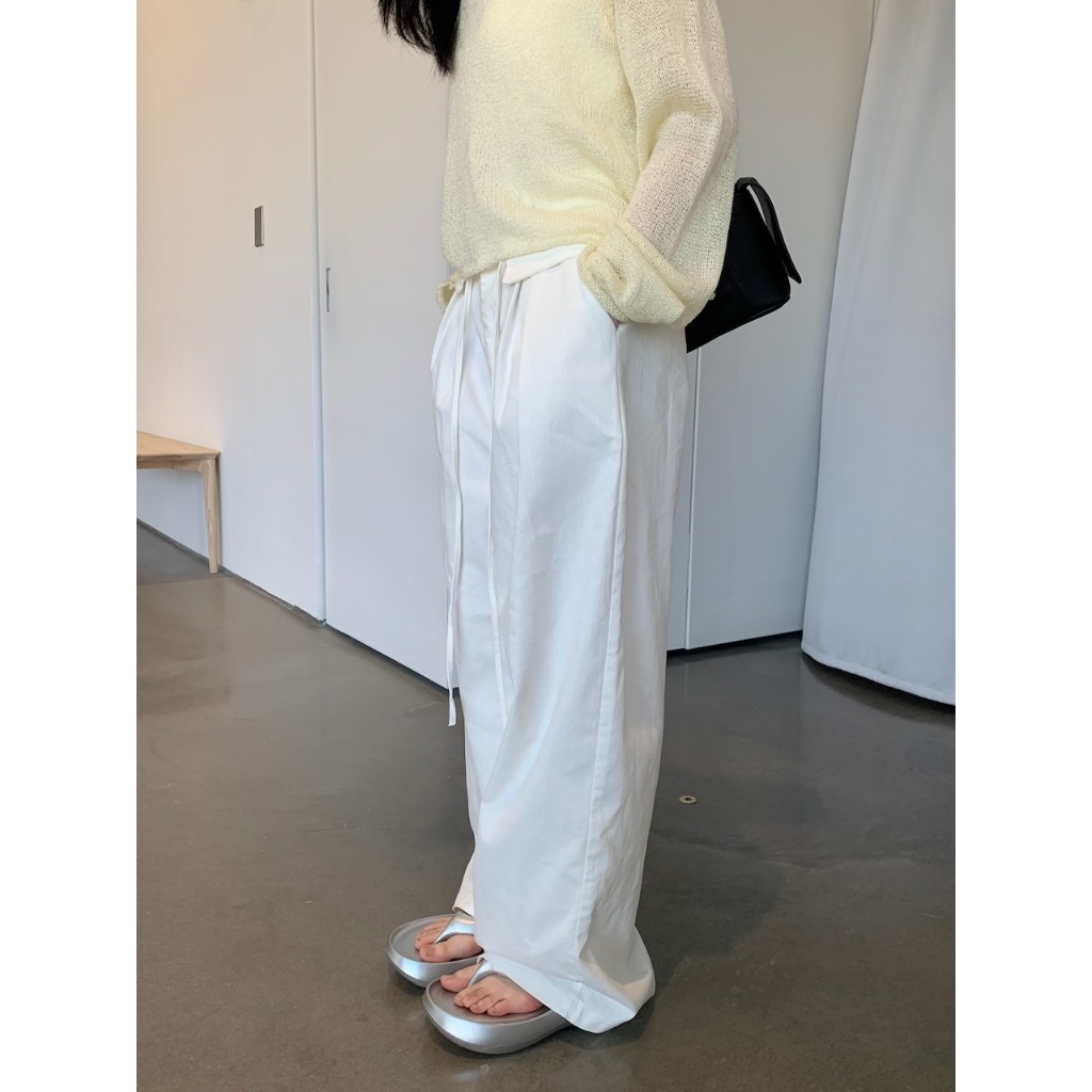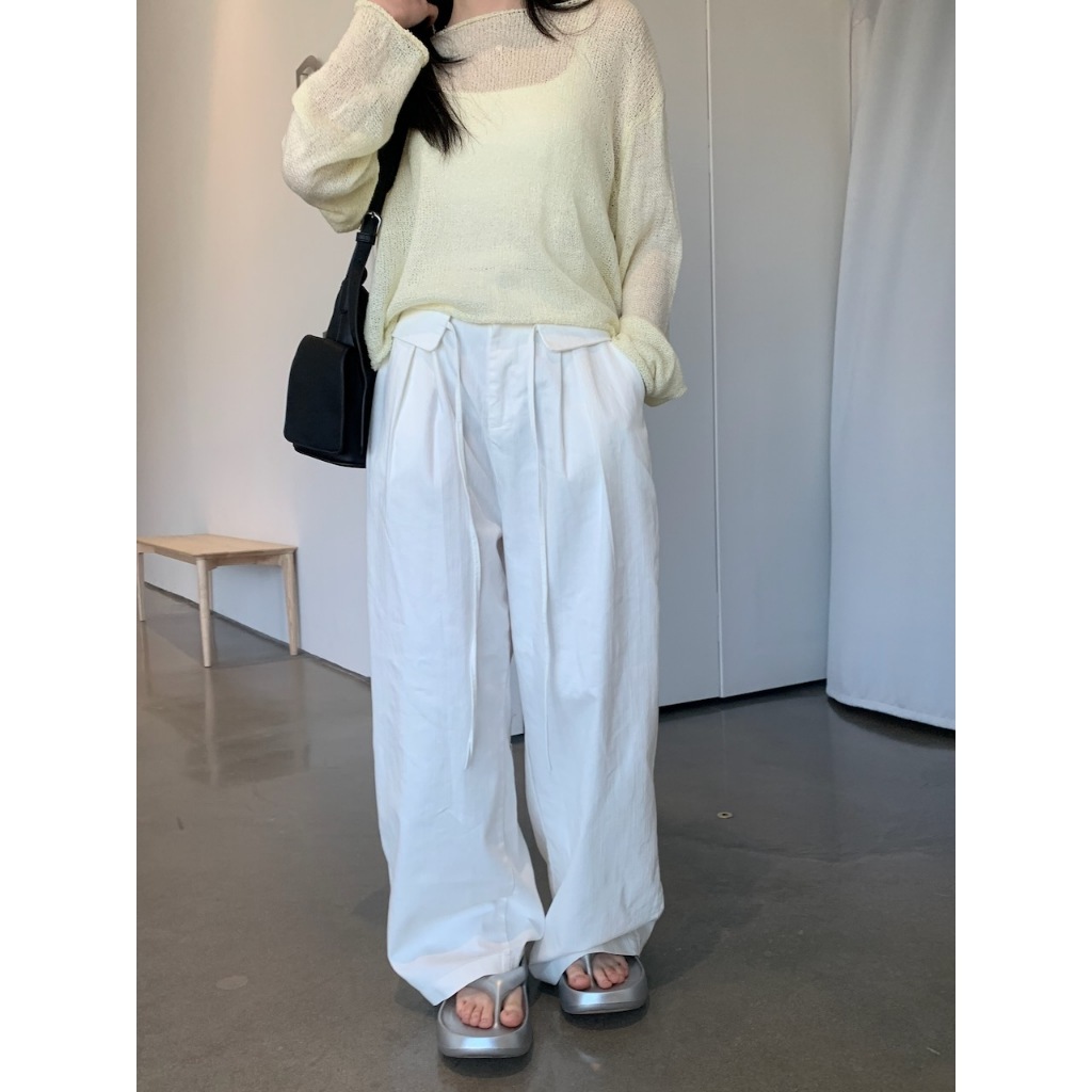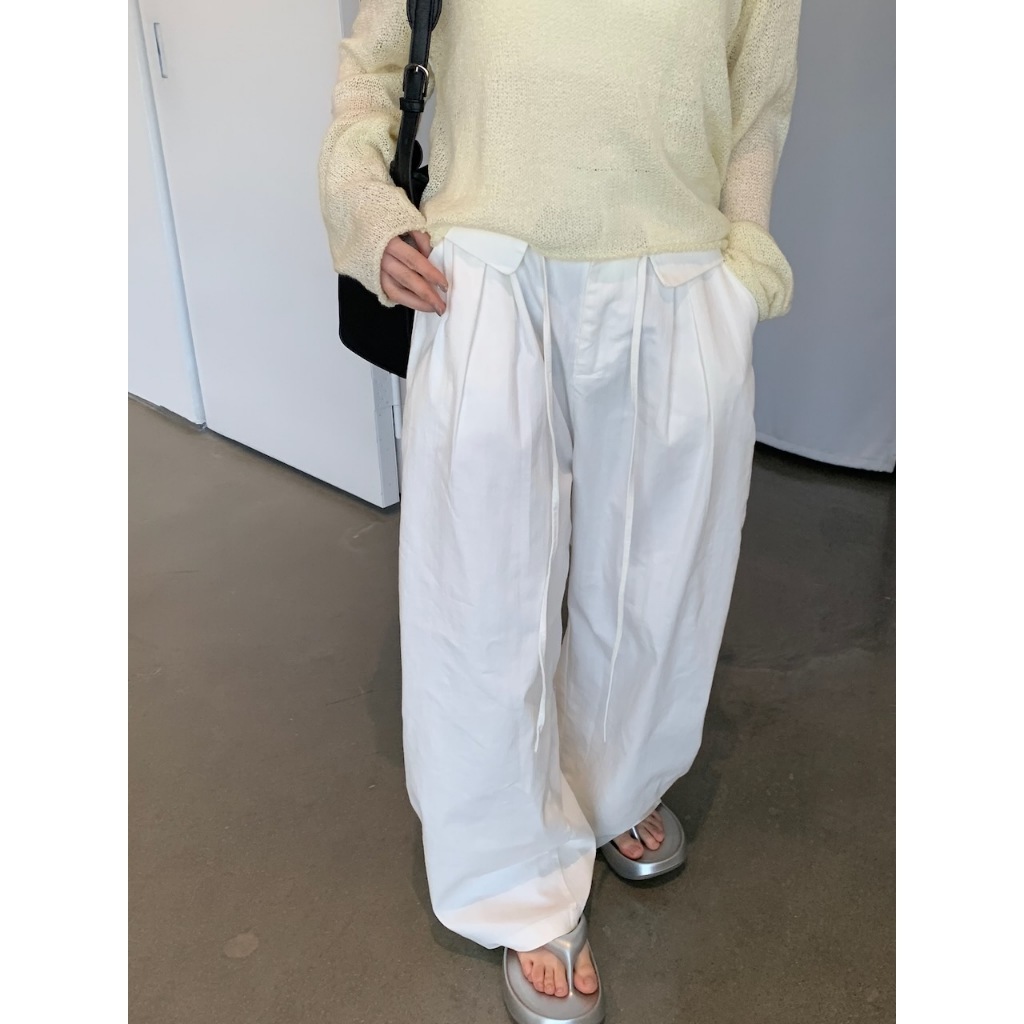※棉麻寬褲 前褲頭假領式綁帶設計 前面兩側真口袋 真鈕扣拉鍊式 素色