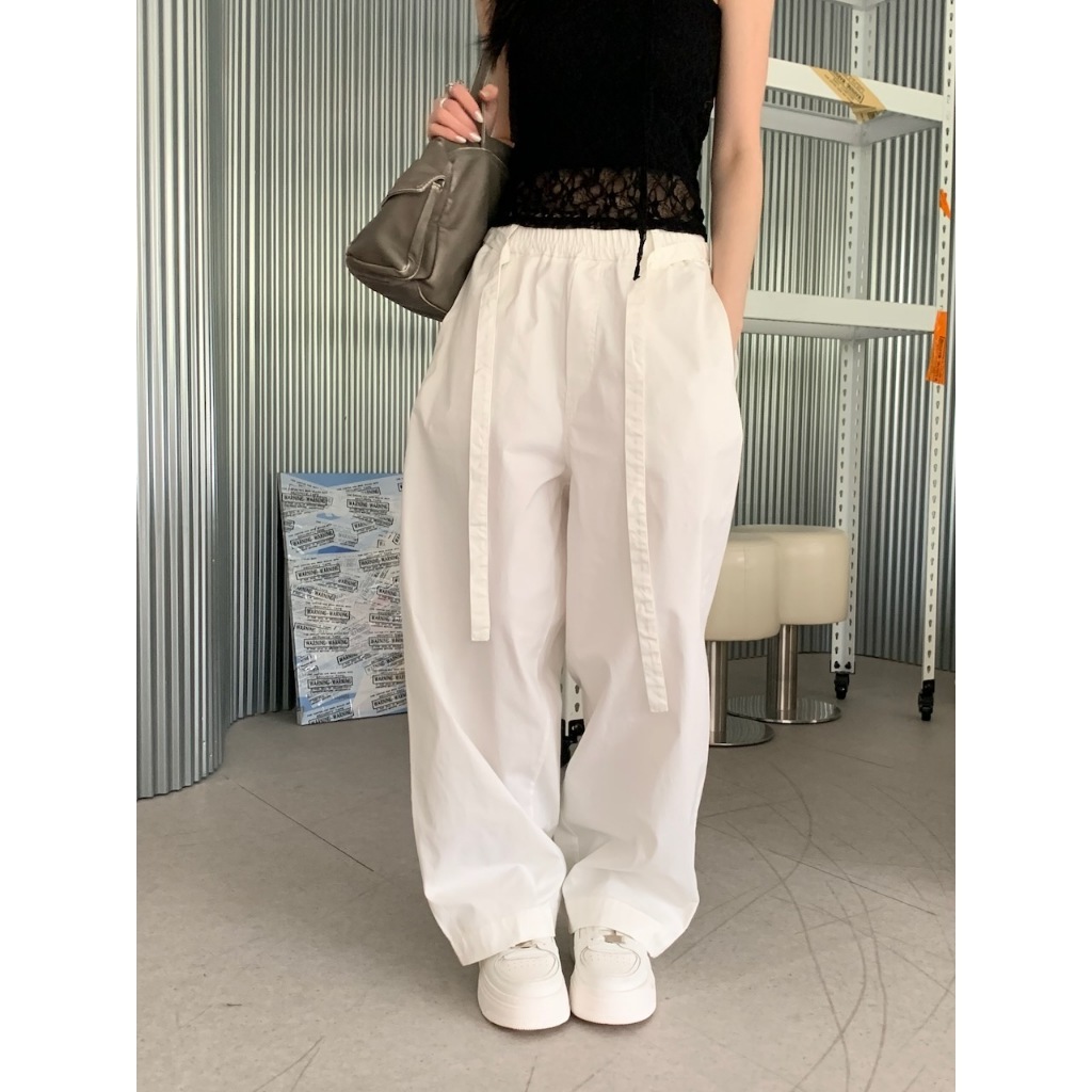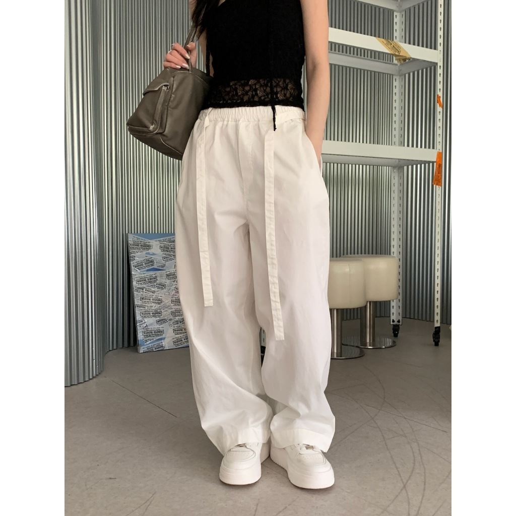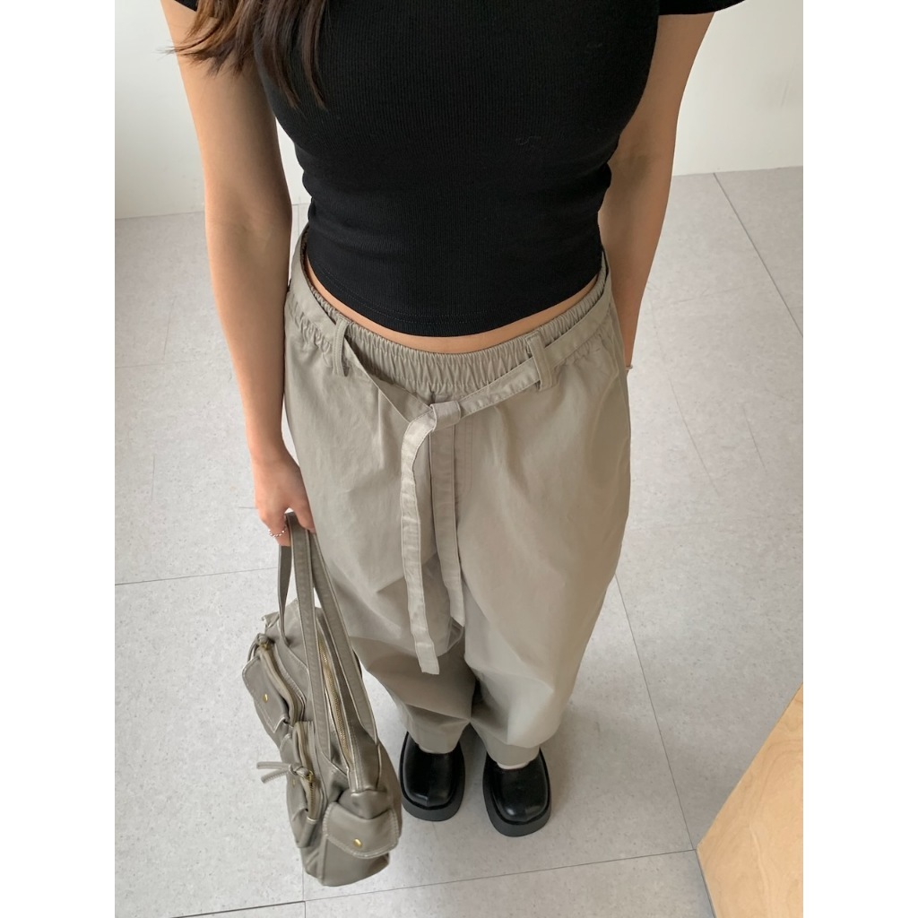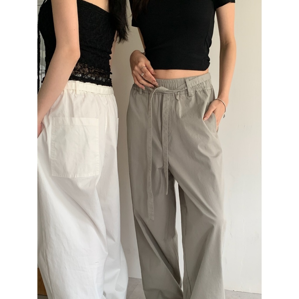 ※繭型寬褲 腰圍整圈鬆緊 附綁帶 前假褲頭拉鍊 兩側、後面真口袋 素色