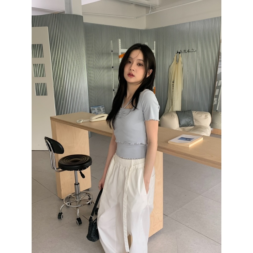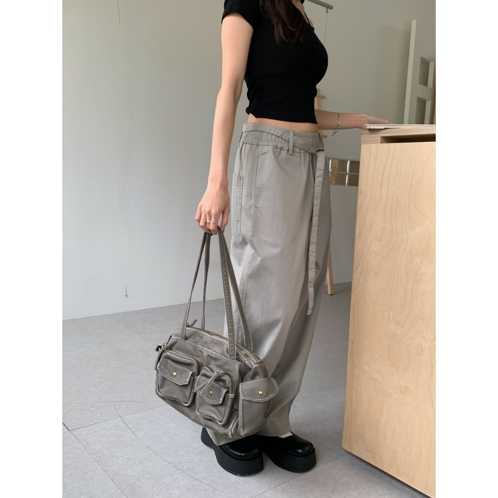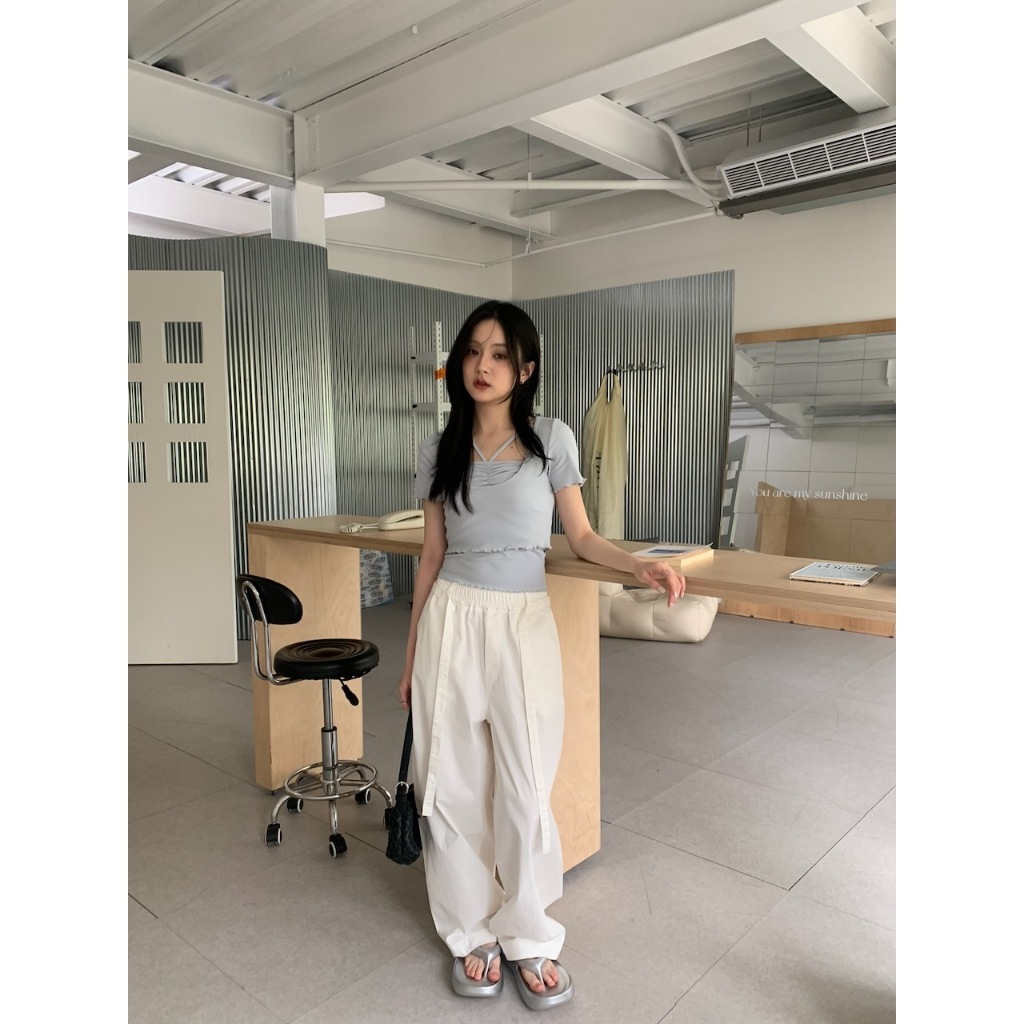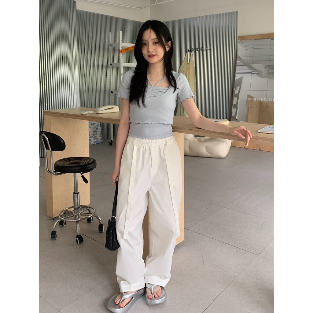 ※繭型寬褲 腰圍整圈鬆緊 附綁帶 前假褲頭拉鍊 兩側、後面真口袋 素色