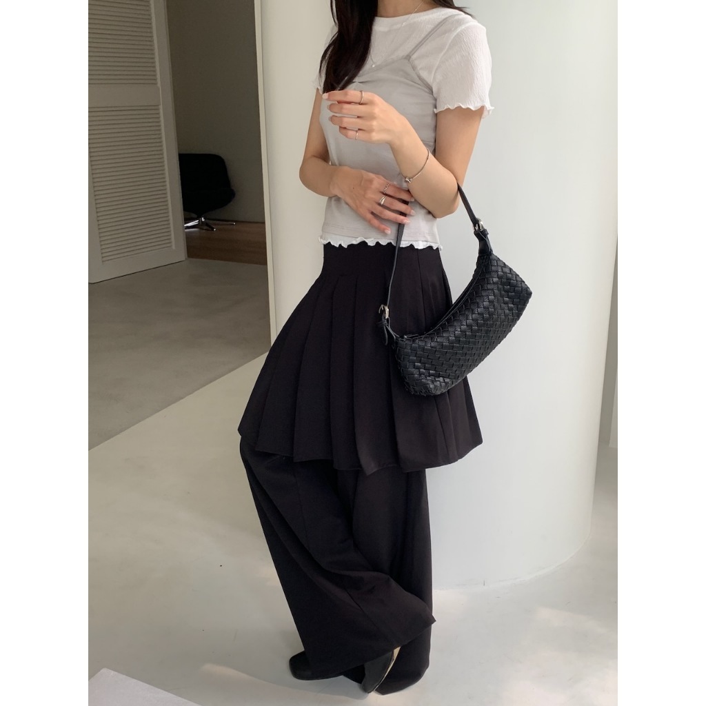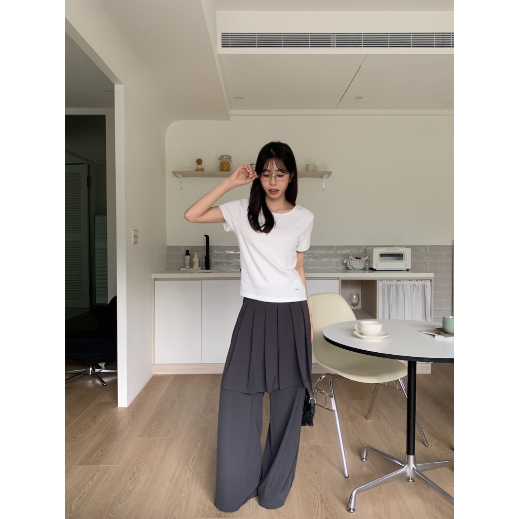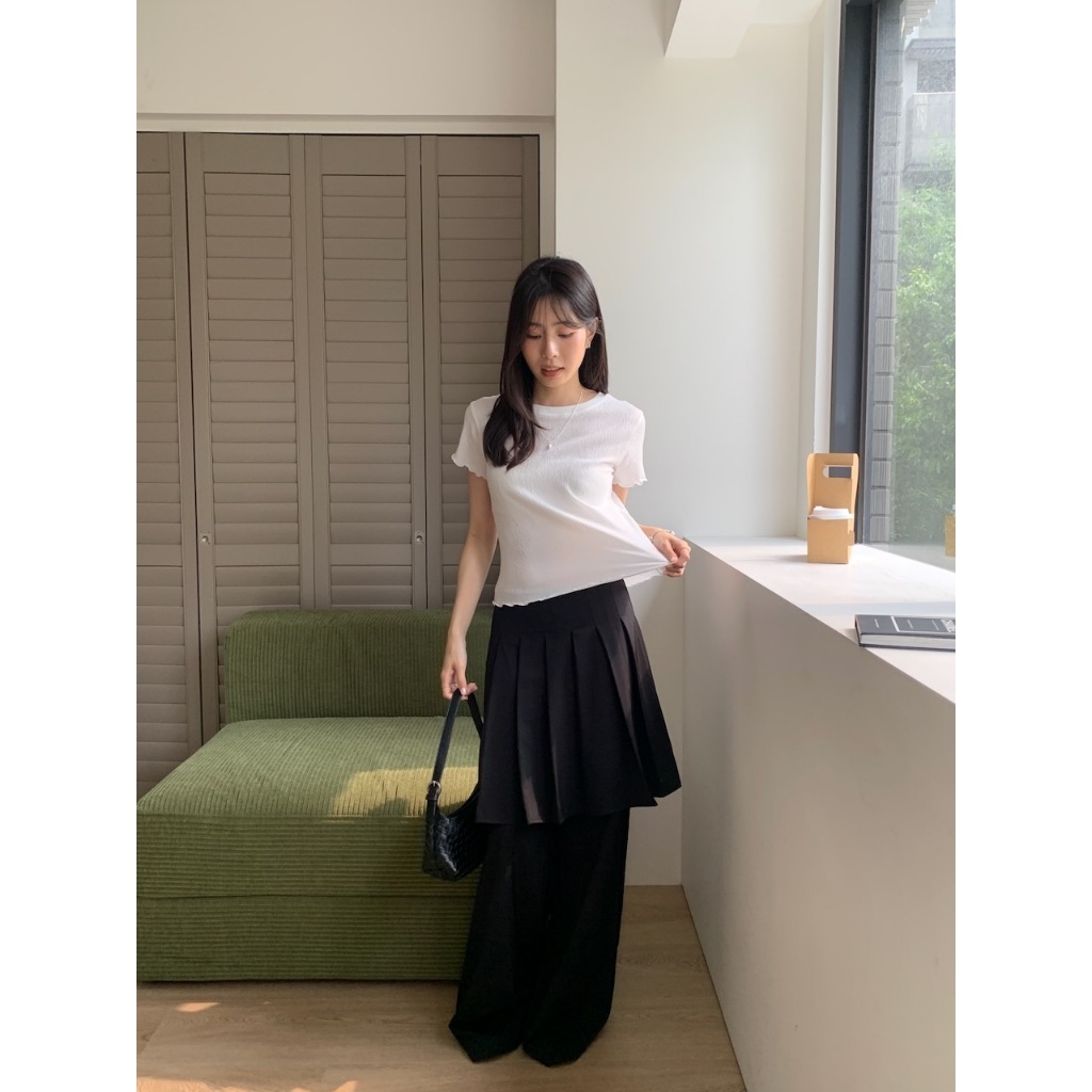 ※假兩件式百褶褲裙直筒寬褲 中長裙 右腰側隱藏式拉鍊 無彈性 素色