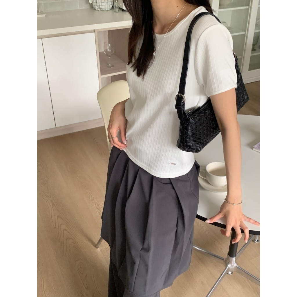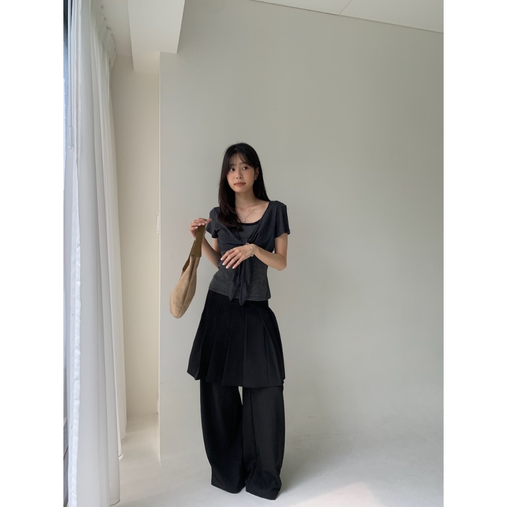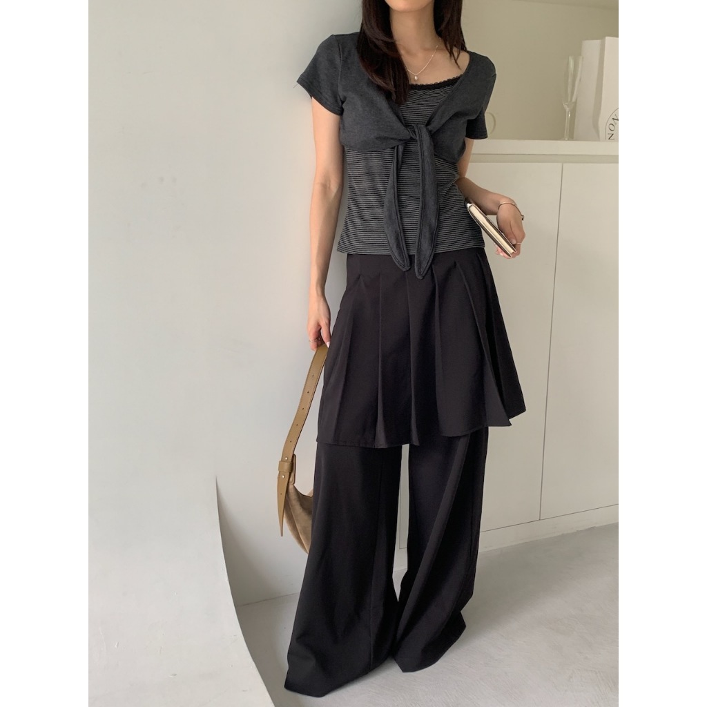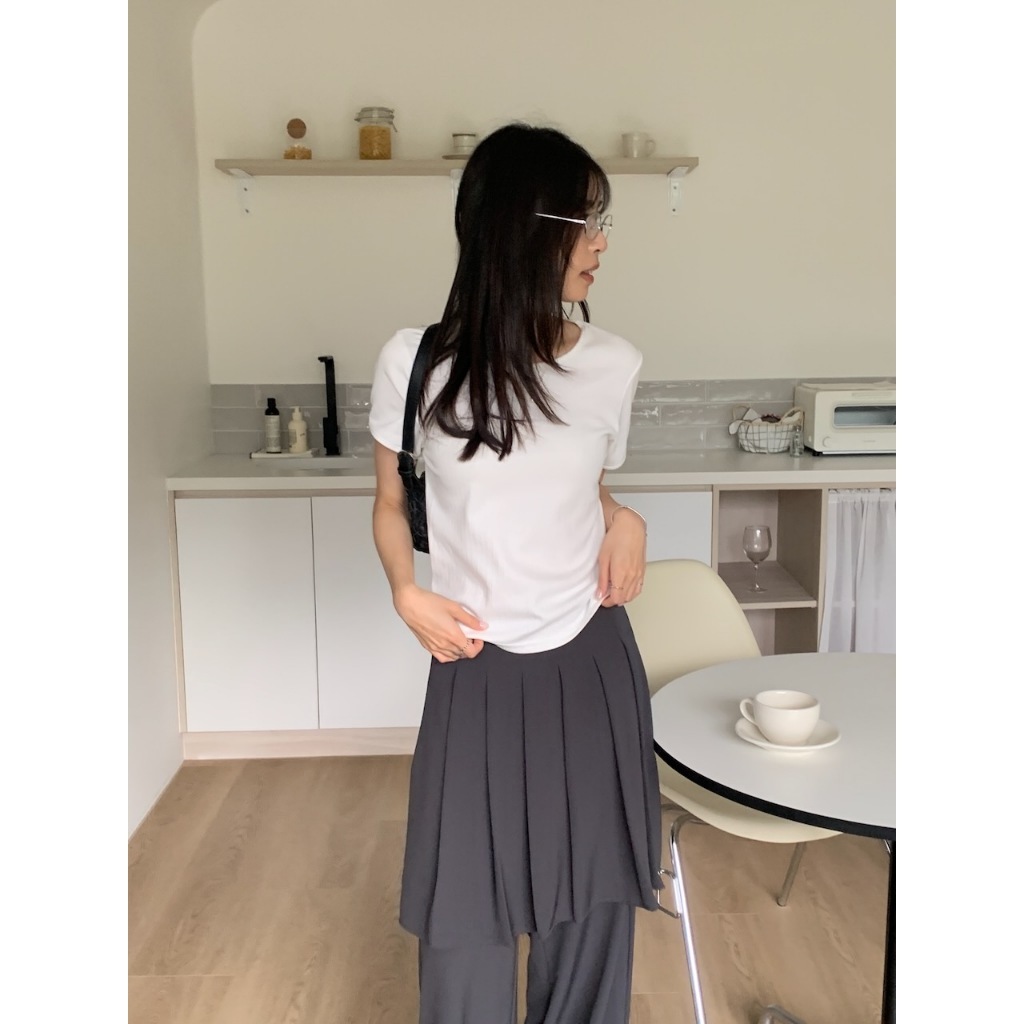 ※假兩件式百褶褲裙直筒寬褲 中長裙 右腰側隱藏式拉鍊 無彈性 素色