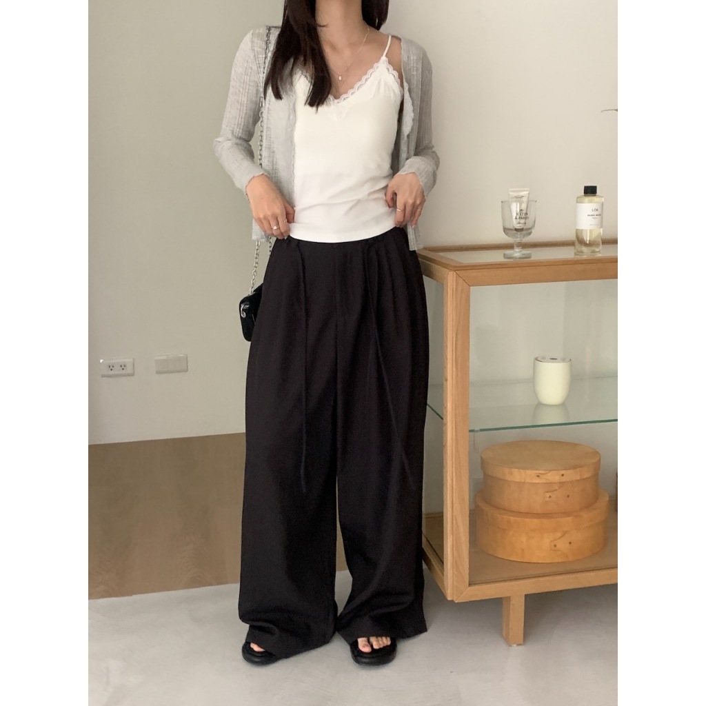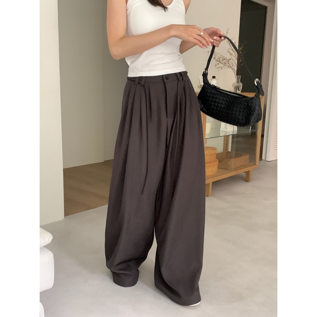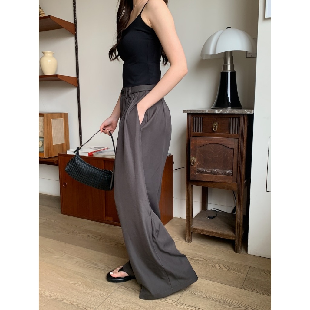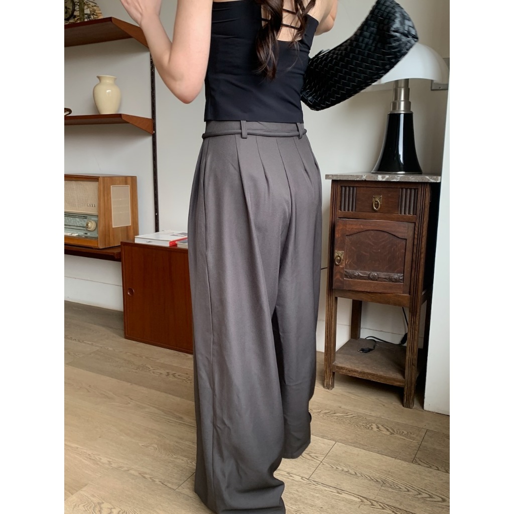 ※繭型西裝寬褲 前鈕扣拉鍊式 左右兩側隱藏式真口袋 落地褲 附綁帶 無彈性 素色