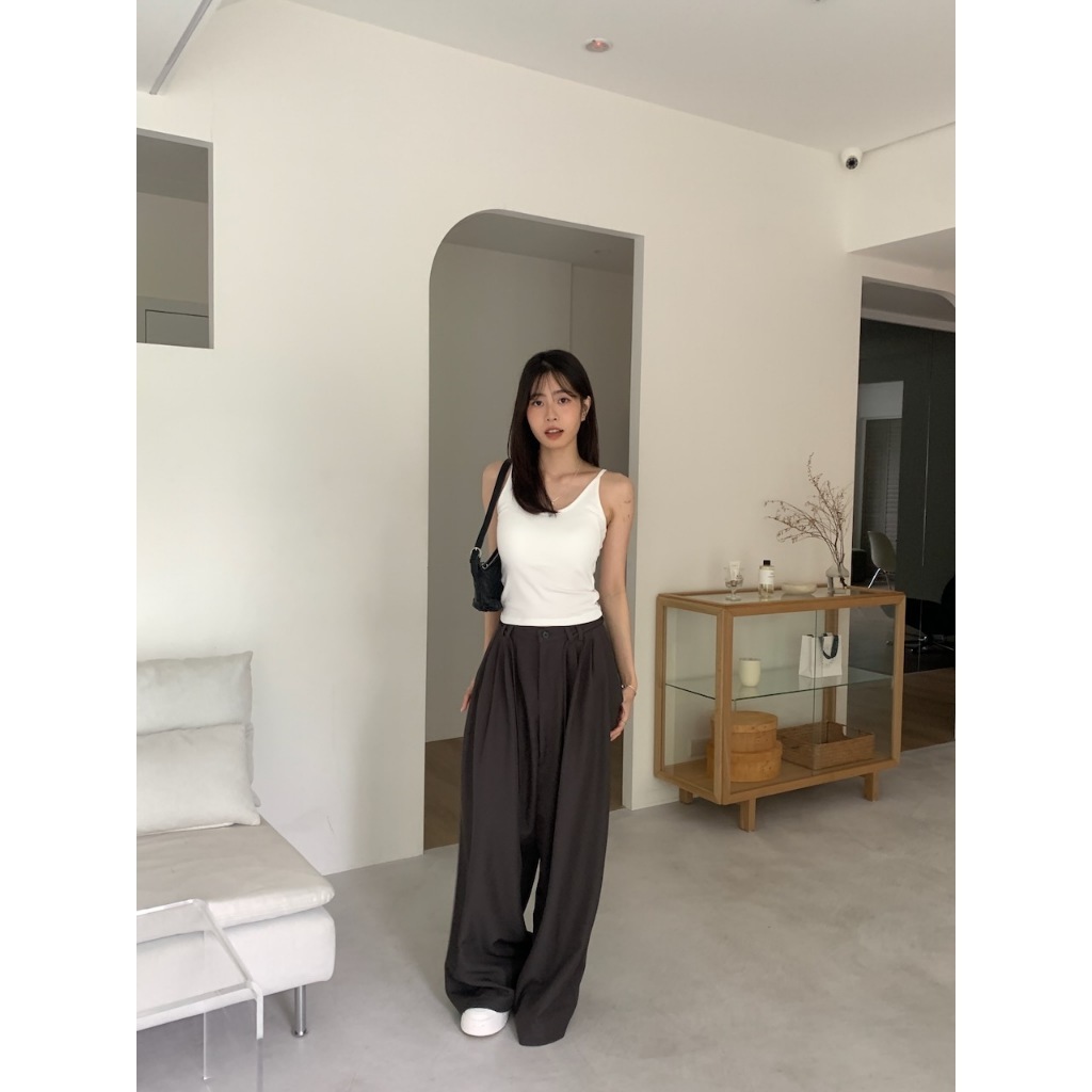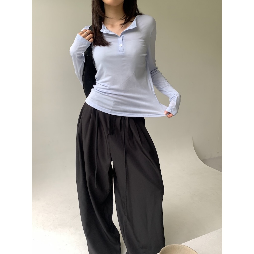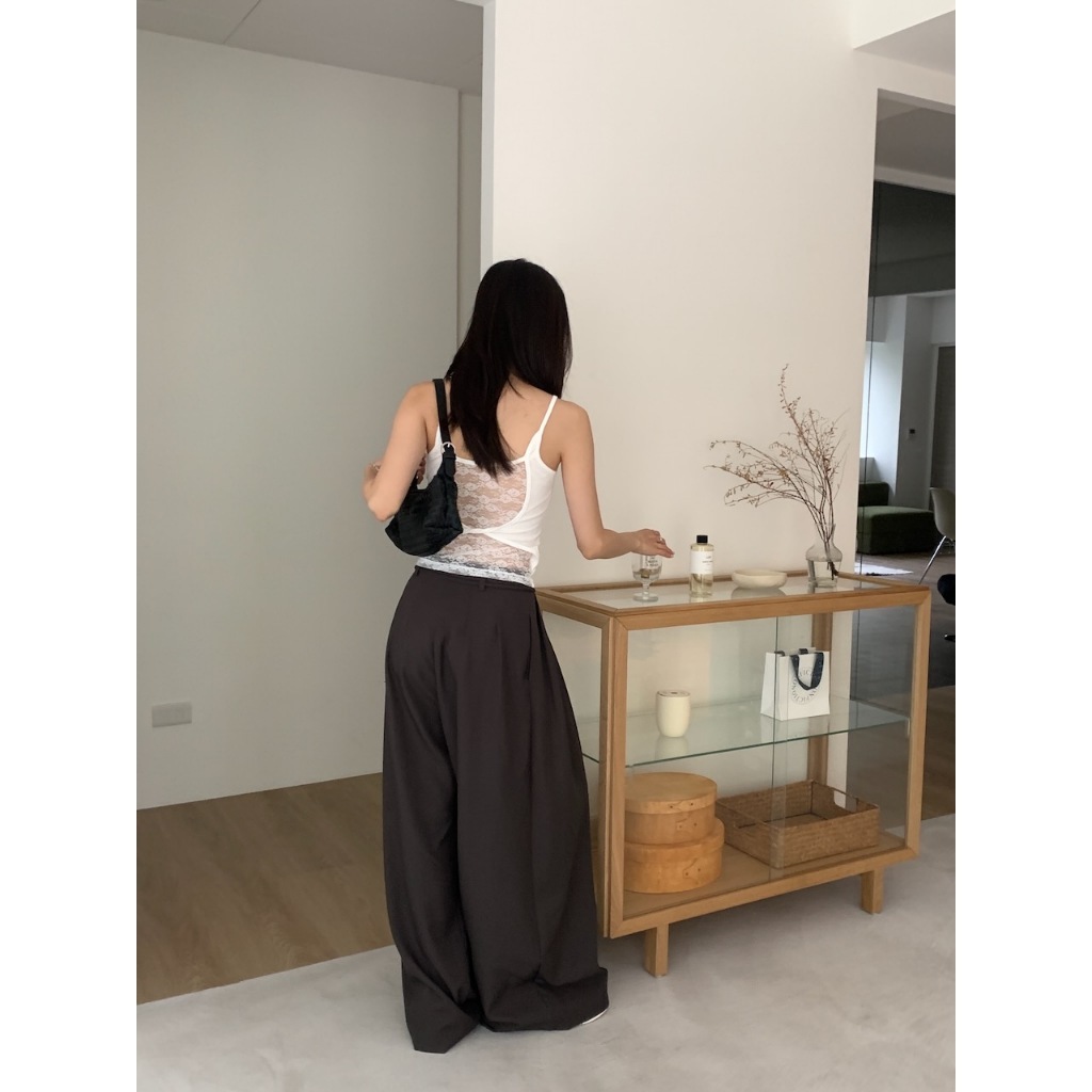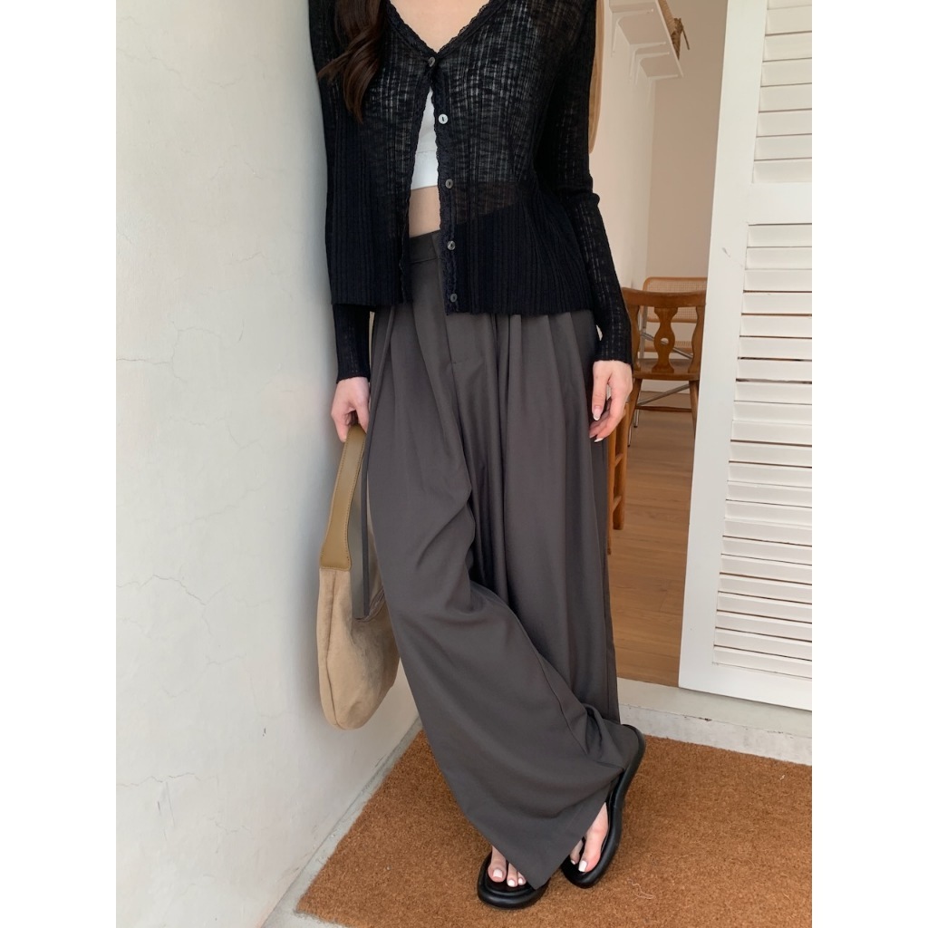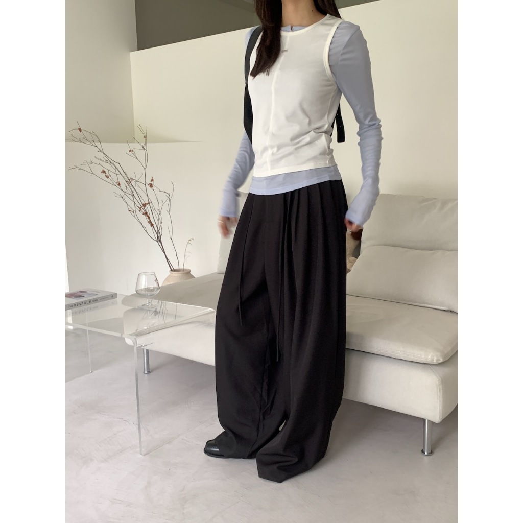 ※繭型西裝寬褲 前鈕扣拉鍊式 左右兩側隱藏式真口袋 落地褲 附綁帶 無彈性 素色